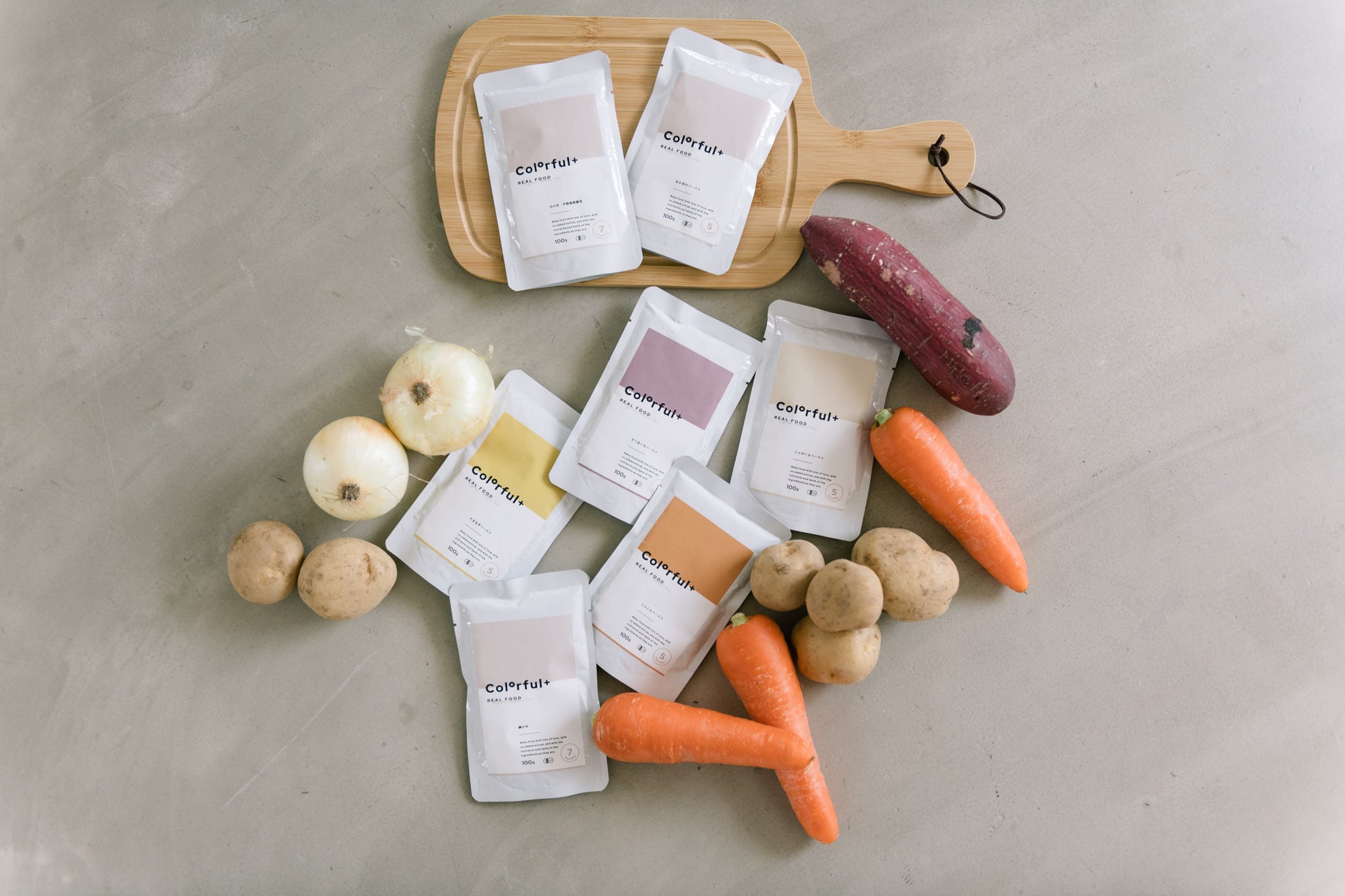パッケージはColorful+の名の通り、野菜の色やおかゆ、魚肉などジャンルごとに色を分けて色彩豊かに仕上げています。