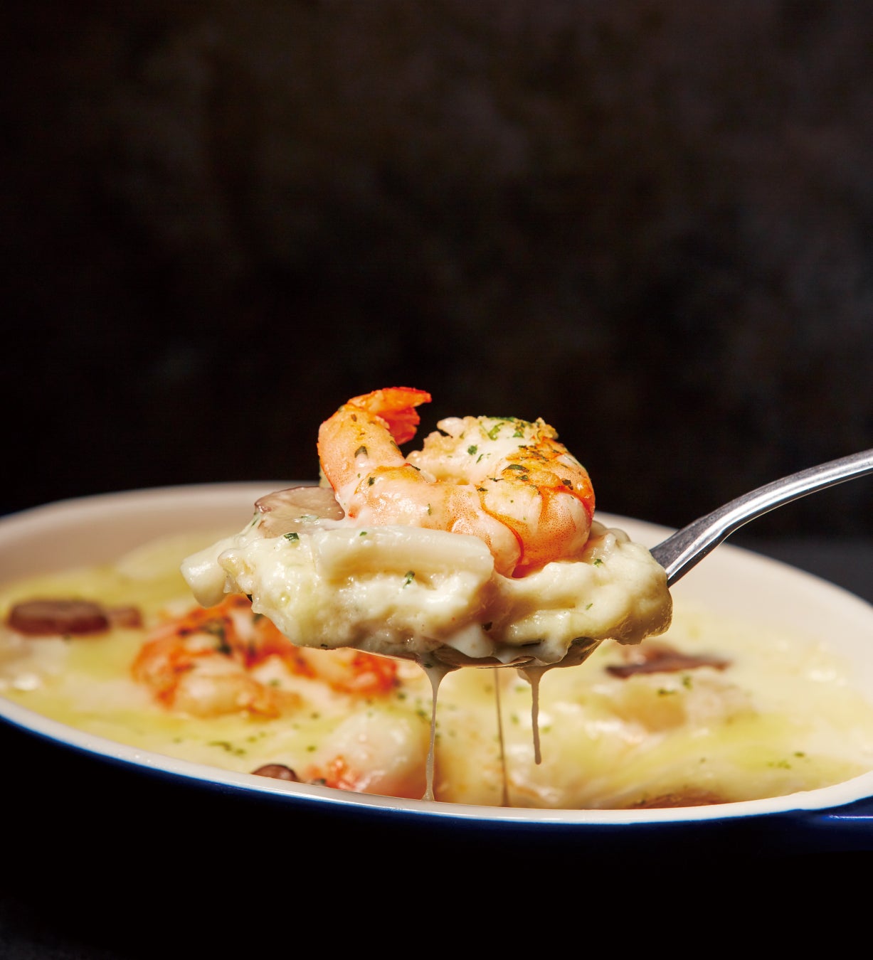 魚介のうま味がぎゅっとつまった特製ホワイトソースと大き目のえびと帆立の存在感が特徴の逸品です。