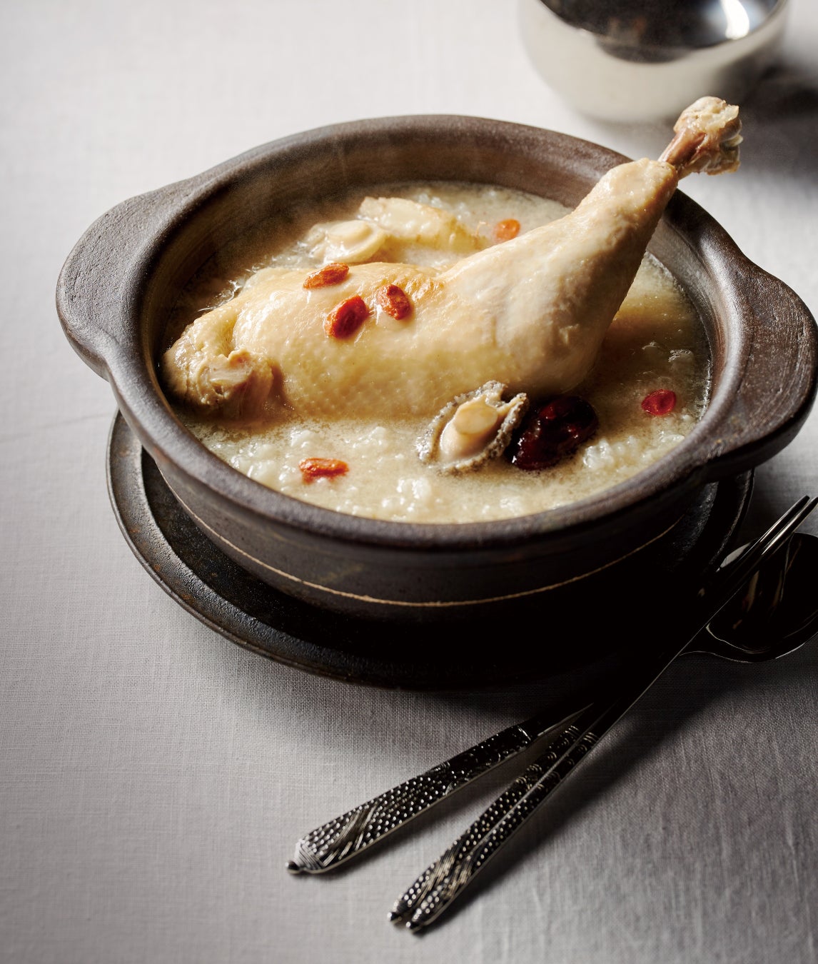 柔らかくほぐれる鶏肉とあわび、高麗人参、くこの実、なつめなどを煮込んだやさしい味わいのスープが自慢です。