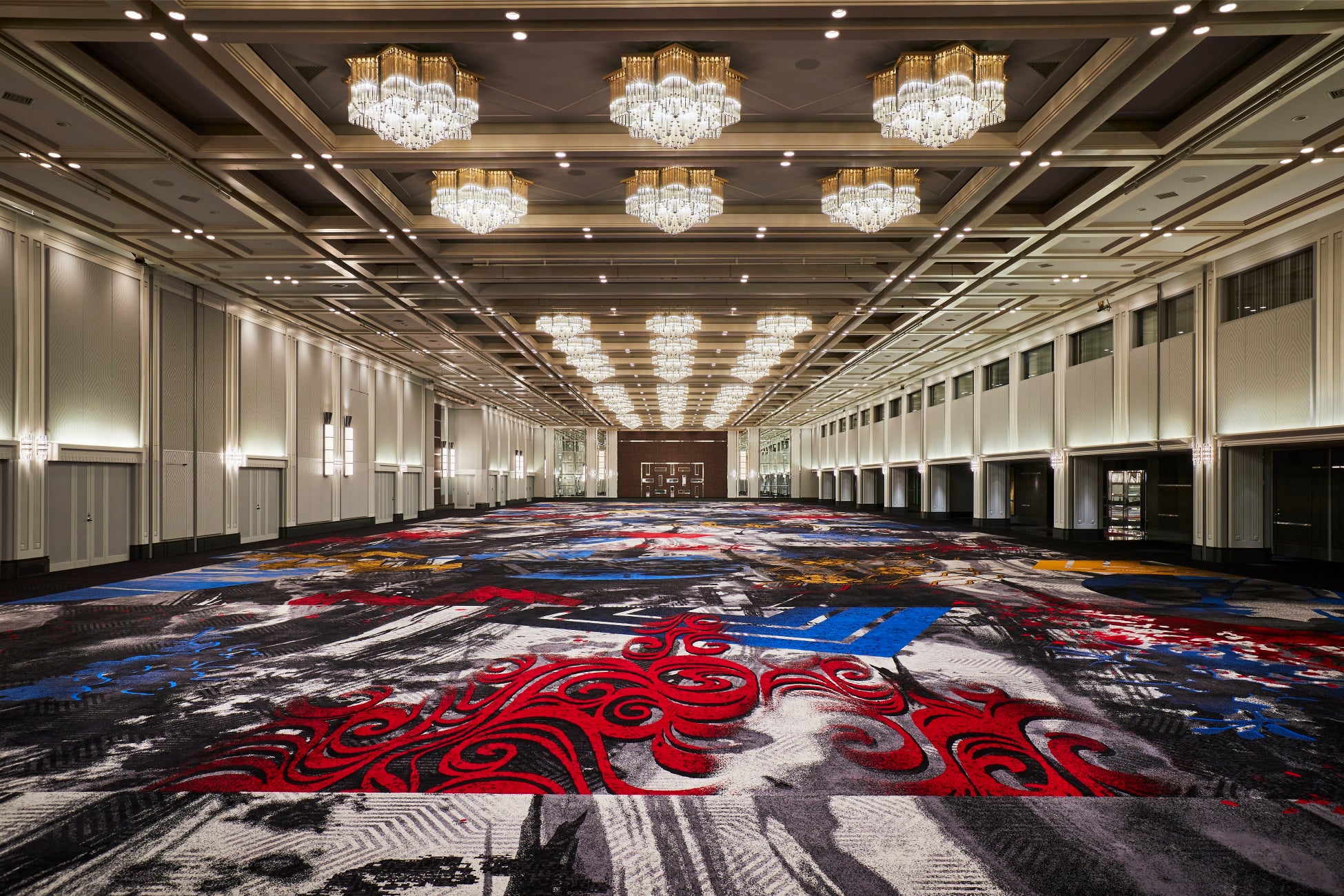 クリスマスディナー&コンサートの舞台となるメインバンケット「鳳凰」は、開業以来35年に渡り数多くの国際会議や記念式典をはじめ、多様な宴席をお手伝いしてきた総面積2,380平方メートルを誇る西日本最大級の宴会場。そんな「鳳凰」が、さまざまなおもてなしができる場を提供したい想いから、「なにわの森羅万象」をテーマとしたカーペットデザインに完全リニューアルしました。