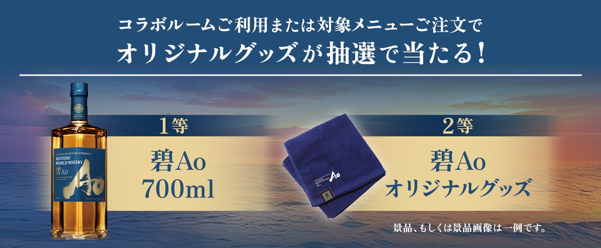 また、銀座数寄屋橋店、八重洲本店、日本橋店では、“碧Ao、知多、角の飲み比べセット”などのコラボメニューを3店舗限定で販売するほか、コラボルームを利用いただいたお客様や、コラボメニューを注文いただいたお客様にオリジナルグッズをプレゼントします。