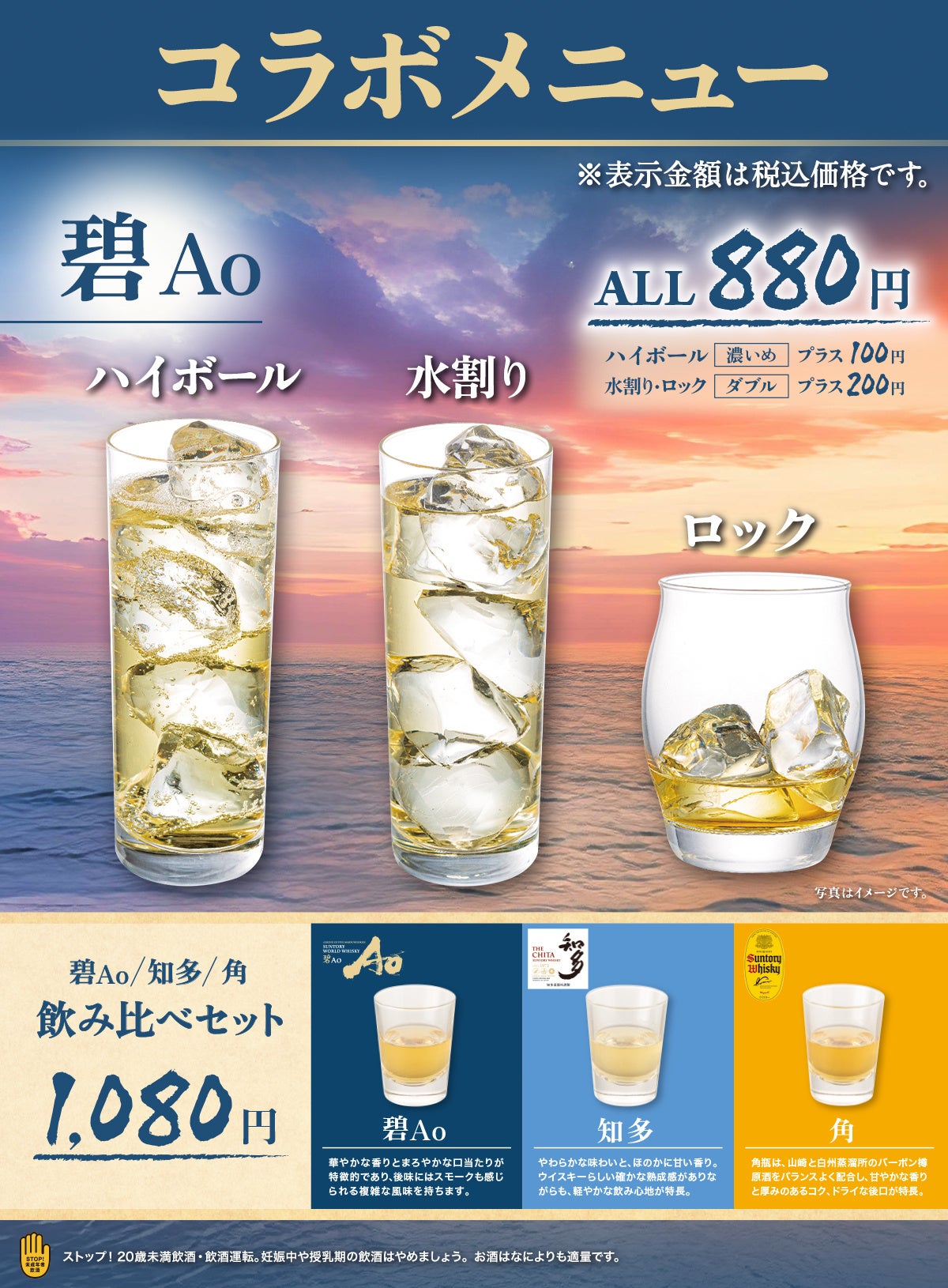 また、「碧Ao」をはじめとしたウイスキーを使ったコラボメニューを、銀座数寄屋橋店、八重洲本店、日本橋店の3店舗限定で販売します。