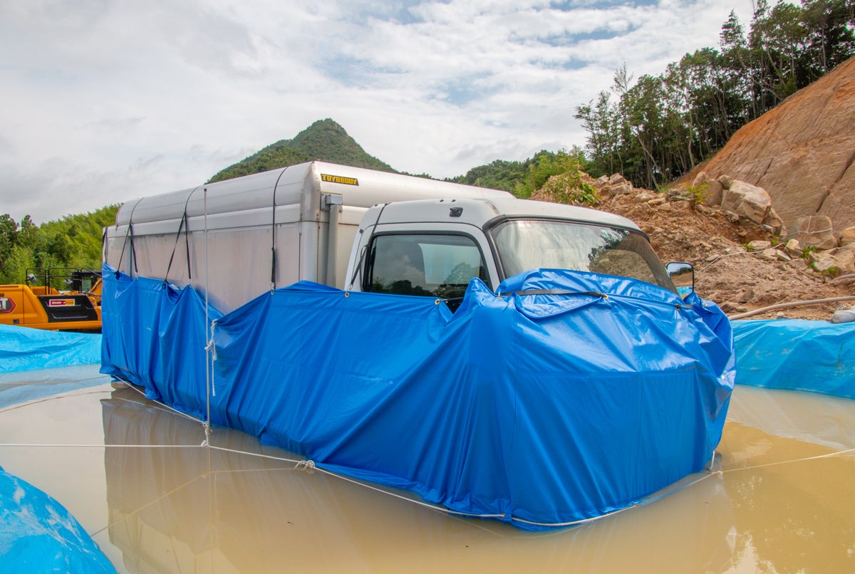 商品の特長としては、イノベックス国内自社工場で製造する耐水性と破れにくさに優れた特殊なシートを使用し、耐浸水性を圧倒的に高めております。また、トラックなどの商用車を多数所有する事業者での使用も想定し、浸水害が発生するまでの限られた時間で対策が取れるよう、車両1台あたり数名にて数分での取り付けが可能な設計としました。