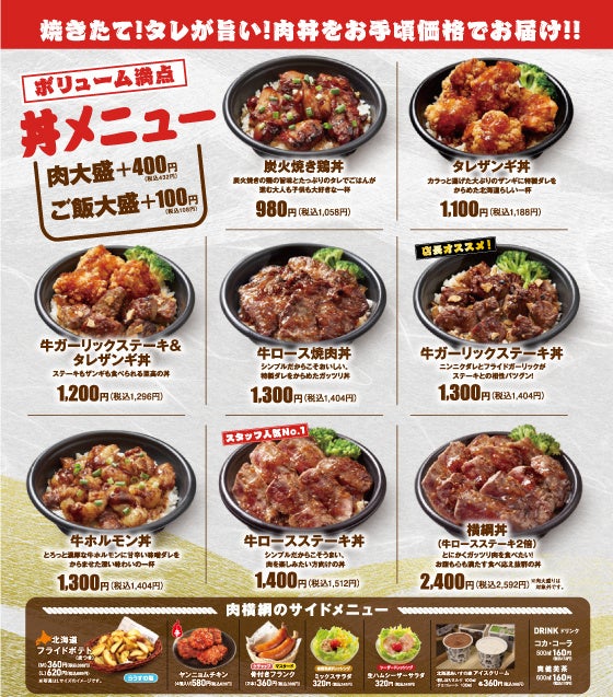 提供するメニューは定番のステーキ丼・カルビ丼をはじめ、北海道らしいザンギ丼や変わり種のみそ味ホルモン丼などの全8種類。その他、サラダなどのサイドメニューも取り揃えています。