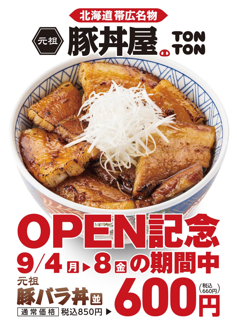 桃山店のオープンを記念して、9/4(月)〜8(金)の期間中、当店自慢の「豚バラ丼〈並〉」を特別価格600円(税込660円)にて提供いたします。