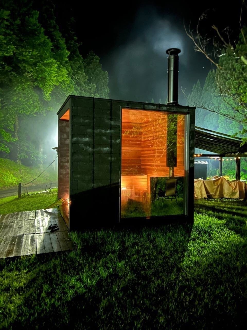 国産キューブ型屋外サウナ「RIISI」。熱量を存分に味わえる2段ベンチ構造と広々とした室内により、ゆったり贅沢にサウナを味わえます。大きなガラス面からは自然の風景を存分に楽しめます。