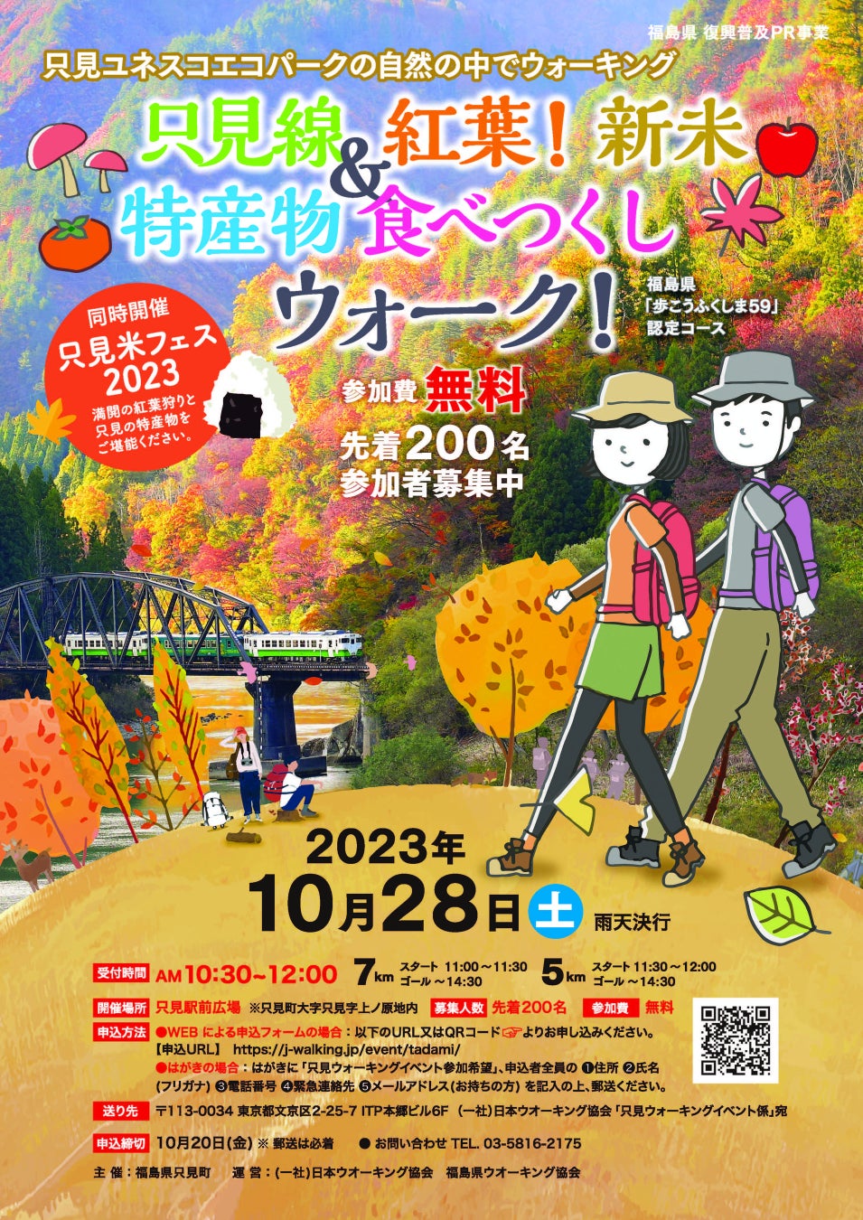 ウォーキングコースは福島県「歩こうふくしま59」認定コース。「只見米フェス 2023」も同時開催! 満開の紅葉狩りと只見の特産物をご堪能ください。