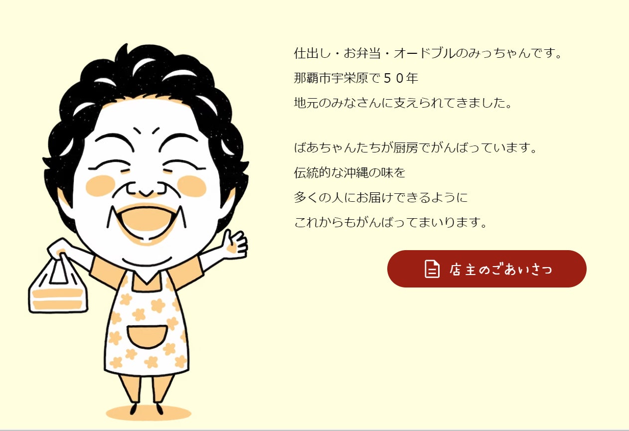 仕出し、お弁当、オードブルのみっちゃん弁当です。 沖縄県那覇市宇栄原で50年。地元のみなさまに愛されて営業を続けてまいりました。 地元沖縄のおばー(おばあちゃん)たちの手作り、沖縄伝統料理を提供します。