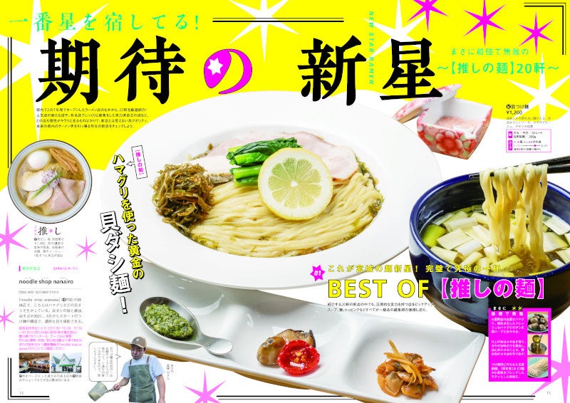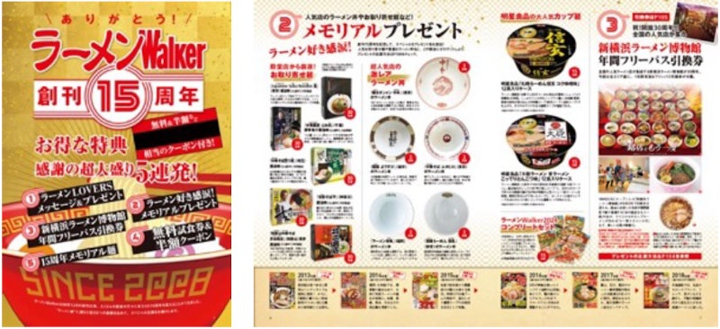 創刊15周年を記念した巻頭企画では、「ラーメンWalker」ゆかりのラーメンLOVERSからのメッセージや、歴代表紙でラーメン文化の発展やムーブメントを振り返る企画など、メモリアルコンテンツが満載。また、無料や半額で絶品ラーメンを試食できる特典のほか、超人気店の貴重なラーメン丼や厳選した殿堂店のお取り寄せ麺などが当たるプレゼント特集など、お得な企画が盛りだくさんの内容です。