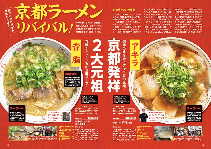 中心部に大学が多かったことから学生のための飲食店が豊富だった京都。激戦区・一乗寺に代表されるようにラーメンも独自のスタイルで進化し、京都独特の文化が生まれたと言われます。今や京都にとどまらず関西圏で広がりを見せる「京都ラーメン」を特集し、2大元祖の「中華そば ますたに」&「京都本家 第一旭 本店」のほか、独自エッセンスを加えた気鋭店にも迫ります。