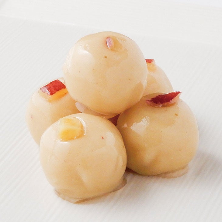 パイン、オレンジ、あんず、キウイ、白玉などを杏仁風味の羊羹に合わせたフルーツポンチ羊羹。