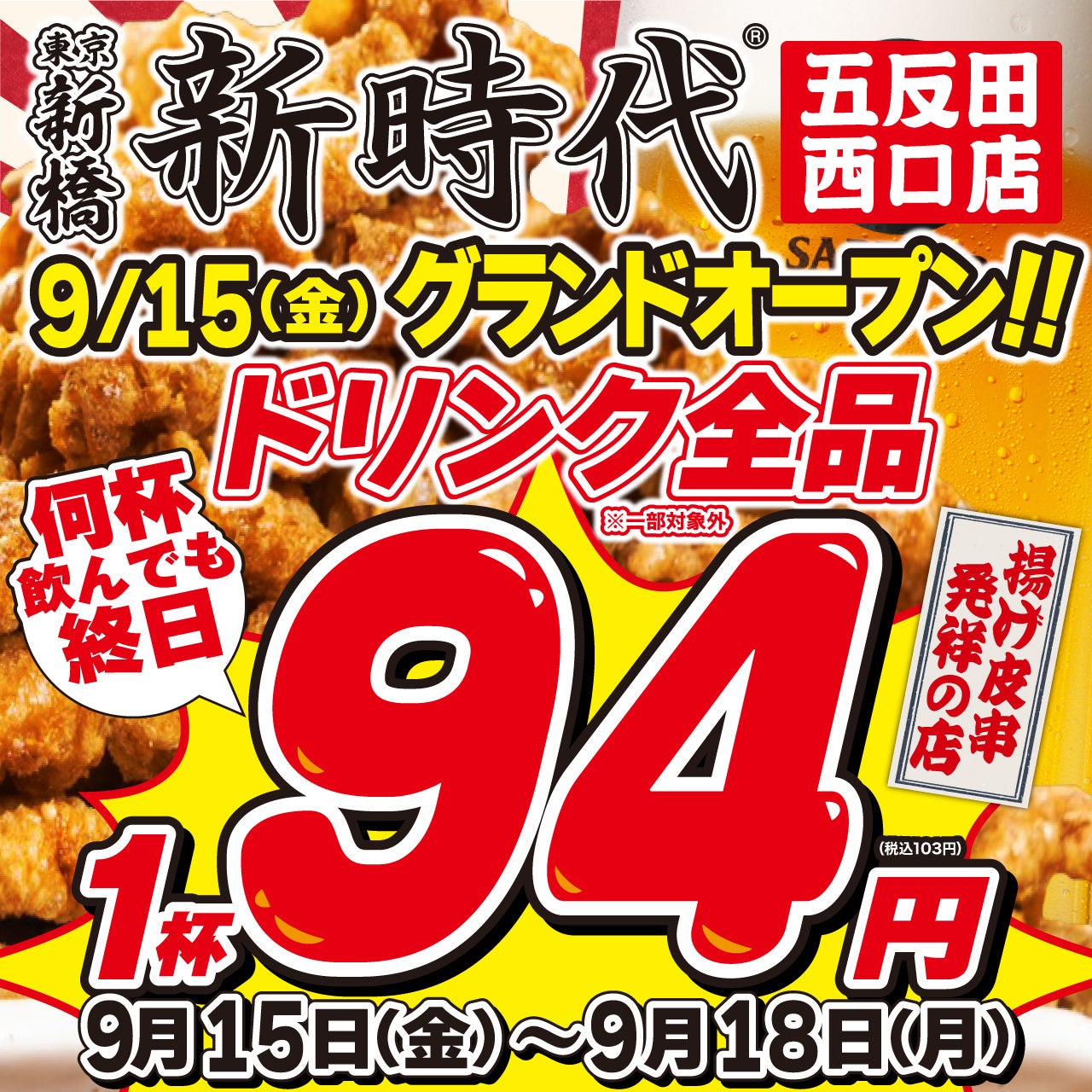 「新時代 五反田西口店」のオープンを記念し、ドリンク全品を1杯94円でお楽しみ頂けるキャンペーンを開催します。