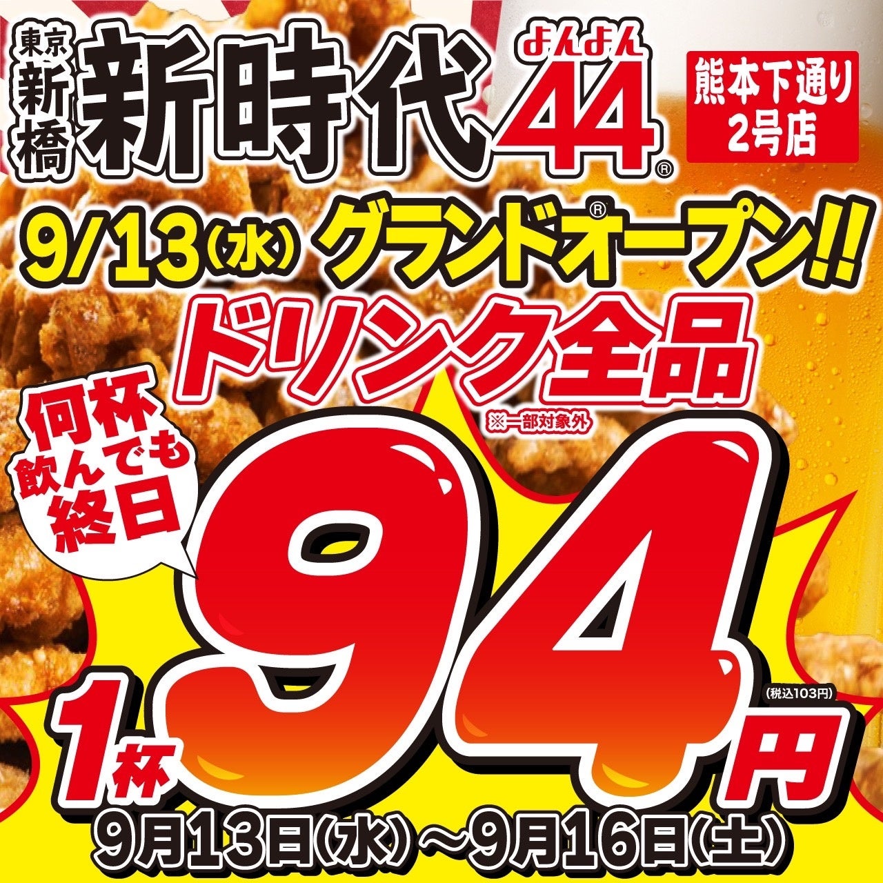 「新時代44 熊本下通り2号店」のオープンを記念し、9月13日(水)~7月16日(土)迄の4日間、ドリンク何杯飲んでも全品1杯94円(税込103円)でお楽しみいただけるキャンペーンを開催します。