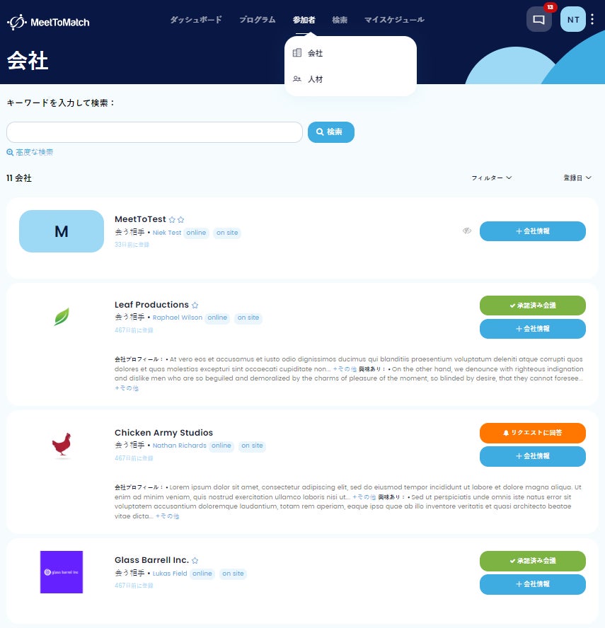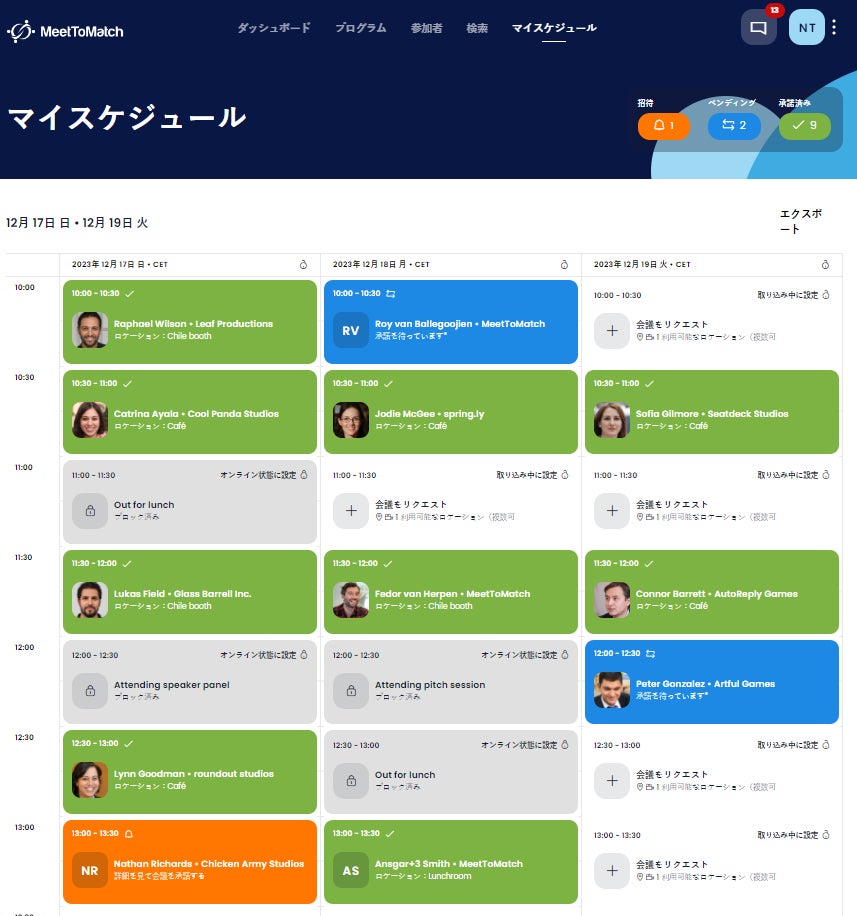 「MeetToMatch」の目的は、日本最大級のゲーム業界のイベント期間中に、様々な参加者とのミーティングを対面またはオンラインでスムーズに計画できるようにすることで、刺激的で最適なイベント体験を創造することです。「MeetToMatch」は、世界中の企業と日本の企業や地域の企業を効果的に結びつけています。