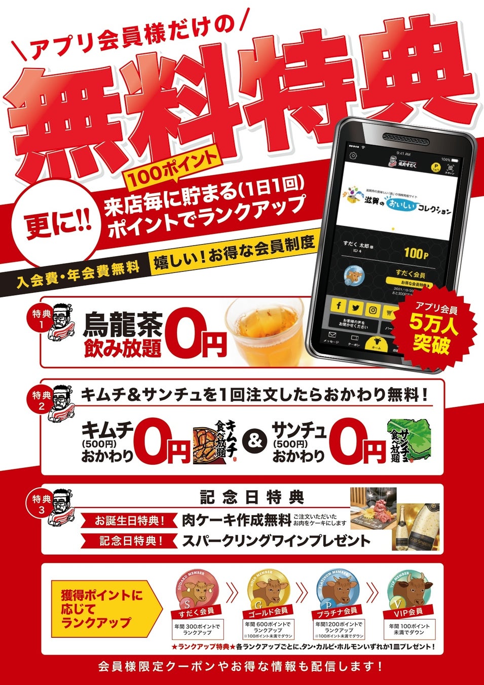 『近江焼肉ホルモンすだく』公式アプリは現在5万人以上の方にダウンロード・ご利用いただいています。アプリ会員は「ウーロン茶」がいつでも無料。また、「キムチ」「サンチュ」はお代わりが無料になります。来店ごとにポイントが貯まり、ポイント数に応じて「ゴールド会員」「プラチナ会員」といった具合にランクアップ。既に会員ランクの最上級である「VIP会員」まで昇進した強者もいらっしゃいます。また、ランクアップするごとにお得なクーポンやオリジナルグッズがもらえます。その他、誕生日・記念日のプレゼントや、アプリ会員限定のキャンペーンやイベントも見逃せません。アプリ会員になれば、行けば行くほど『近江焼肉ホルモンすだく』が楽しくなります。ご来店前にぜひダウンロードを!