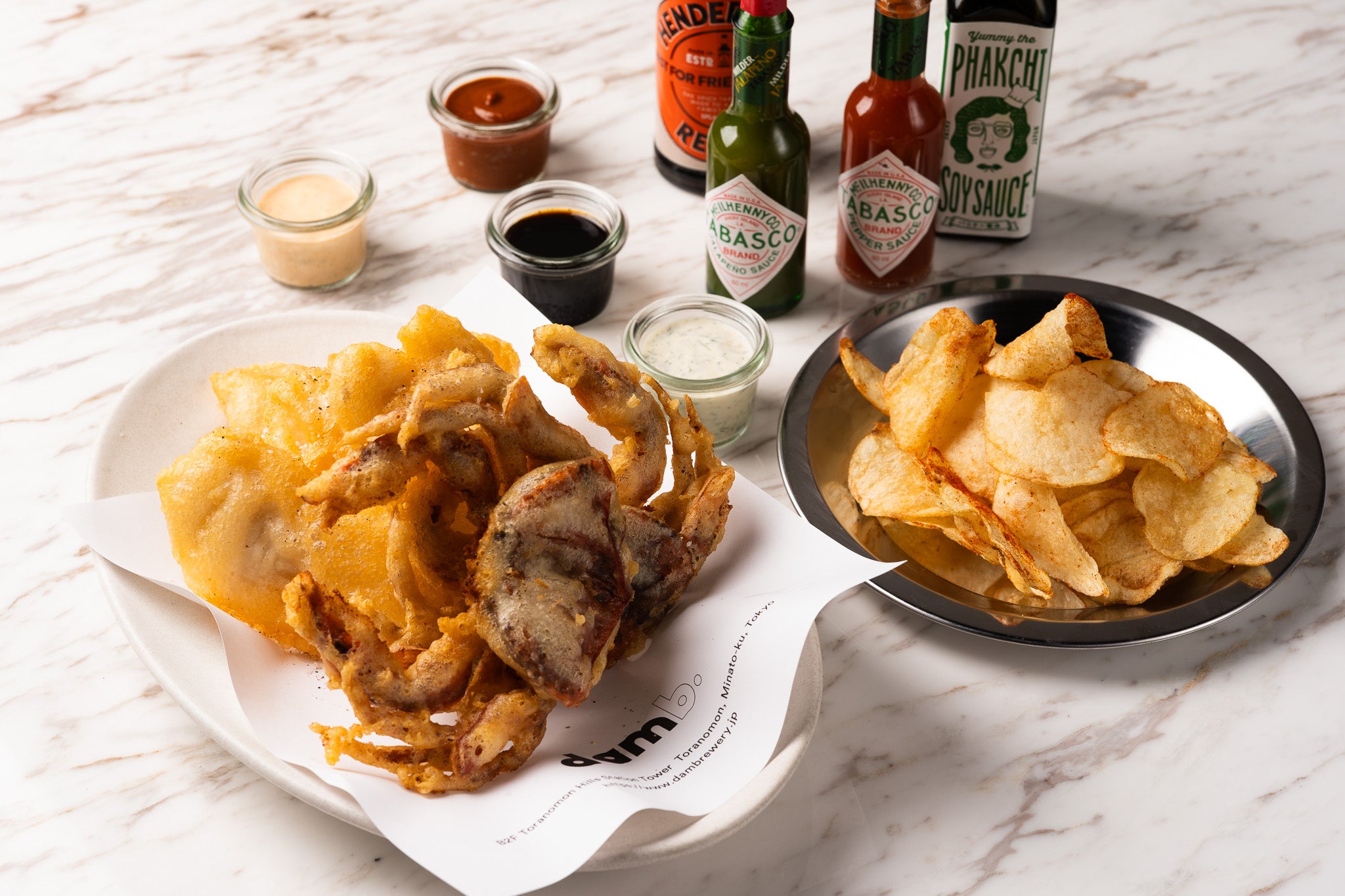 NYミシュラン3つ星店「Jean-Georges」で日本人初のスー・シェフとなり、現在完全紹介制レストラン「No Code」オーナーシェフの米澤文雄氏がフードメニューを監修。シグネチャーメニューは本場イギリスの定番おつまみフィッシュアンドチップス。外はカリっと、中はふんわり食感で仕上げた白身魚に加え、大海老、イカ、ソフトシェルクラブ、サーモンから選択でき、甘辛いBBQソースや爽やかなハーブがアクセントのアンチョビハーブタルタルを含む4種類のディップソースもご用意。スパイスの匠と称される米澤氏が施すオリジナルスパイスを使用したポテトチップスとともに、お好みの組み合わせをお楽しみください。