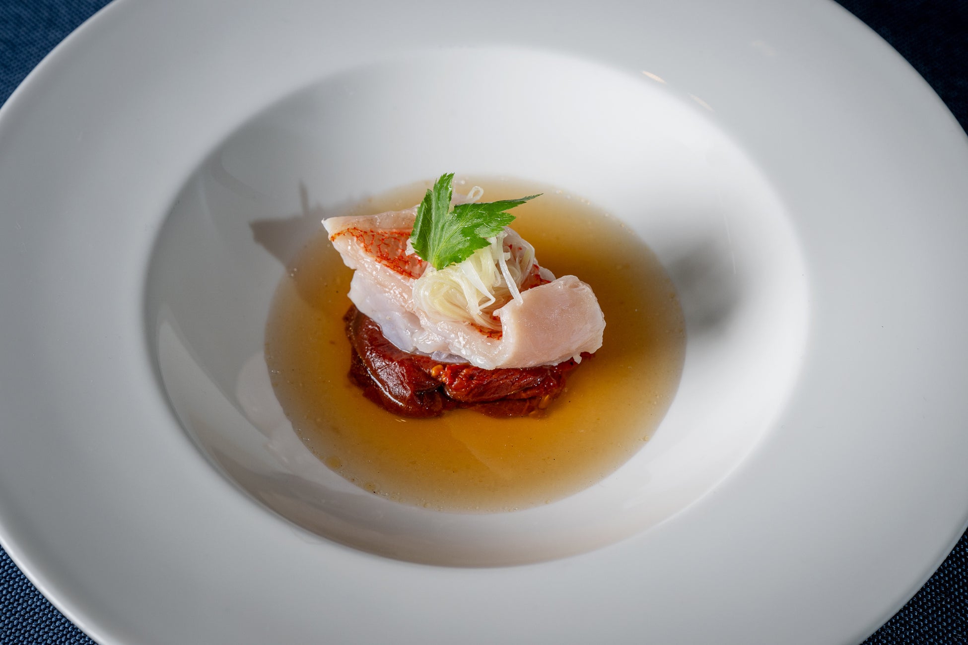 夏に収穫された酸味が強いトマトを皮を剥いて半乾燥させオリーブオイル漬けし、皮は乾燥させる。トマトに皮の抽出液を加えて半乾燥トマトを還元させる。還元させたトマトをベースにひき、日高昆布締めしたキンキの昆布蒸しを乗せ、削りたての鰹節の出汁をはる。香油をかけたネギと三葉をあしらう。