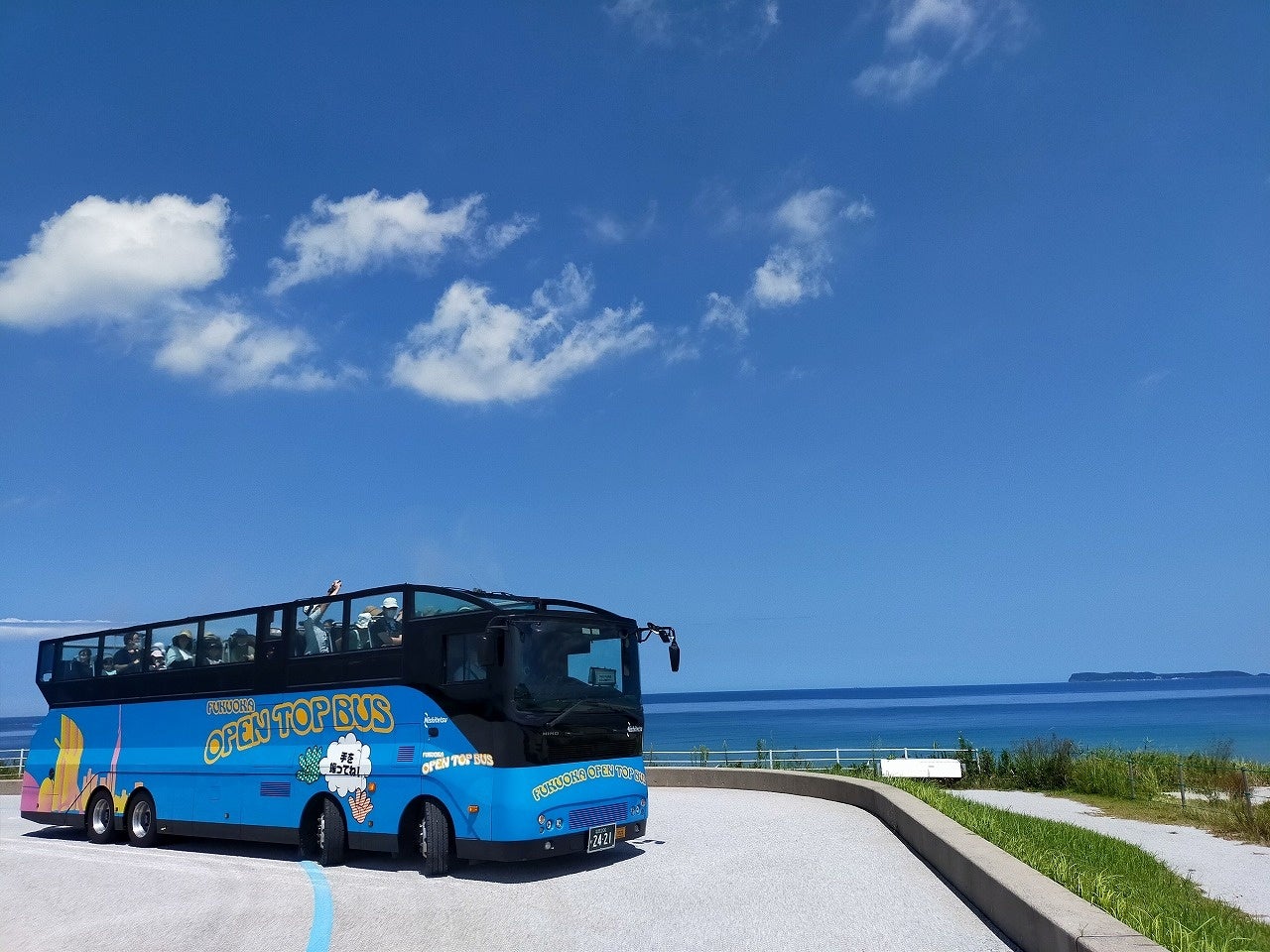 当ツアーは屋根がなく開放的なオープントップバスで、海の中道海浜公園内を運行した後、志賀島を一周するコースです。昨年8月の初実施以降、参加者の方々よりご好評をいただいております。