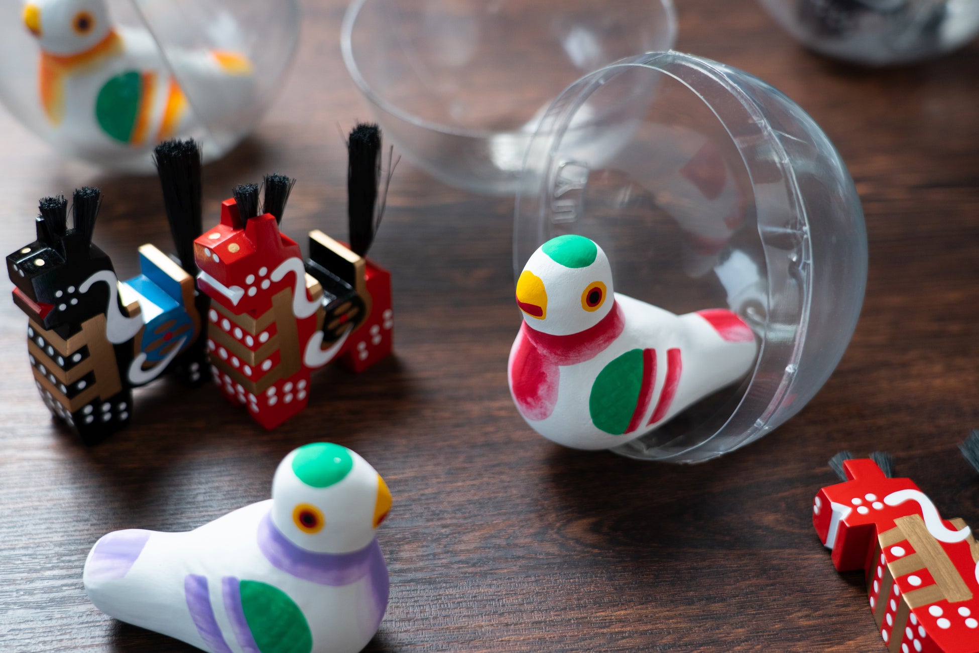福ガチャのレバーを回すと、専用のカプセルに入った青森ならではの縁起物や伝統工芸品が出てきます。福を呼ぶ馬として結婚や新築のお祝いにも用いられる南部地方の郷土玩具「八幡馬(やわたうま)」や、幸せを呼ぶ津軽の郷土玩具と言われる「鳩笛」など、何が出てくるかは回してからのお楽しみです。自宅に持ち帰ってそのまま飾ることができます。
