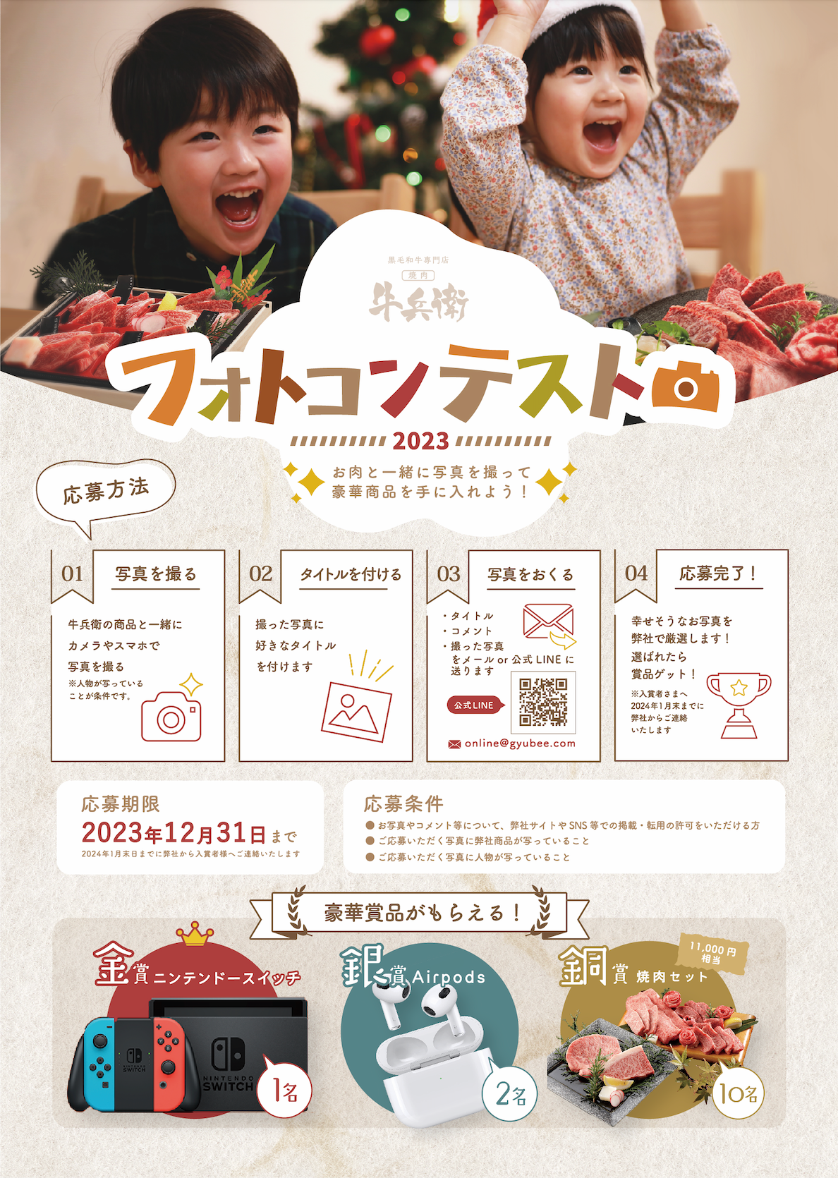 ・ご応募方法 指定のメールアドレスまたは焼肉牛兵衛通販用LINEアカウント宛に下記の内容をお送りください。