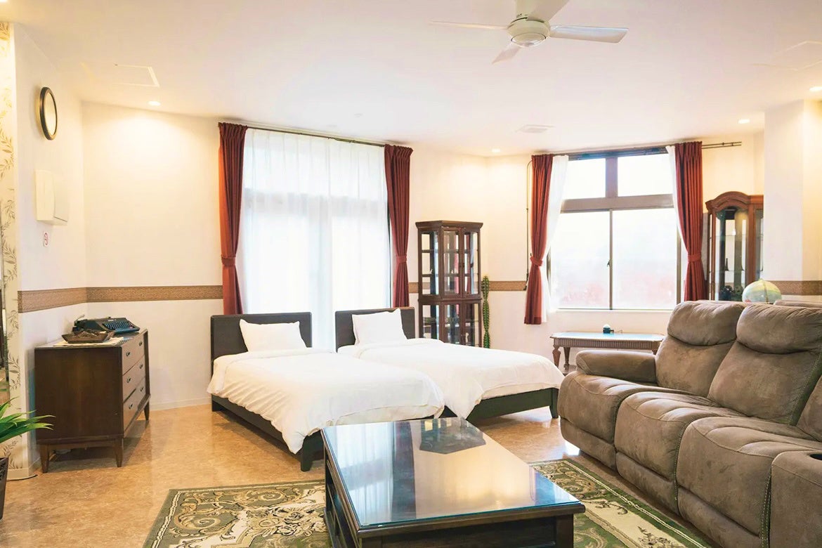 浴室/ベッド/ベビーベッド/IHコンロ付キッチン/エアコン/ウォシュレット付きトイレ/テレビ/洗面化粧台/ドライヤー/冷蔵庫/電子レンジ/電気ポット/調理器具/食器/ソファ/食事用テーブル/アメニティ一式(歯ブラシ、バスタオル、ハンドタオル、シャンプー、トリートメント、ボディソープ)/ Wi-Fi
