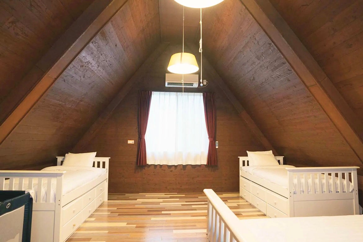 一棟貸切のコテージは、1階がゆったりとおくつろぎ頂けるリビングルーム、2階がベッドルームとなっております。遊具付きの中庭に直結したテラスが全棟にございます。
