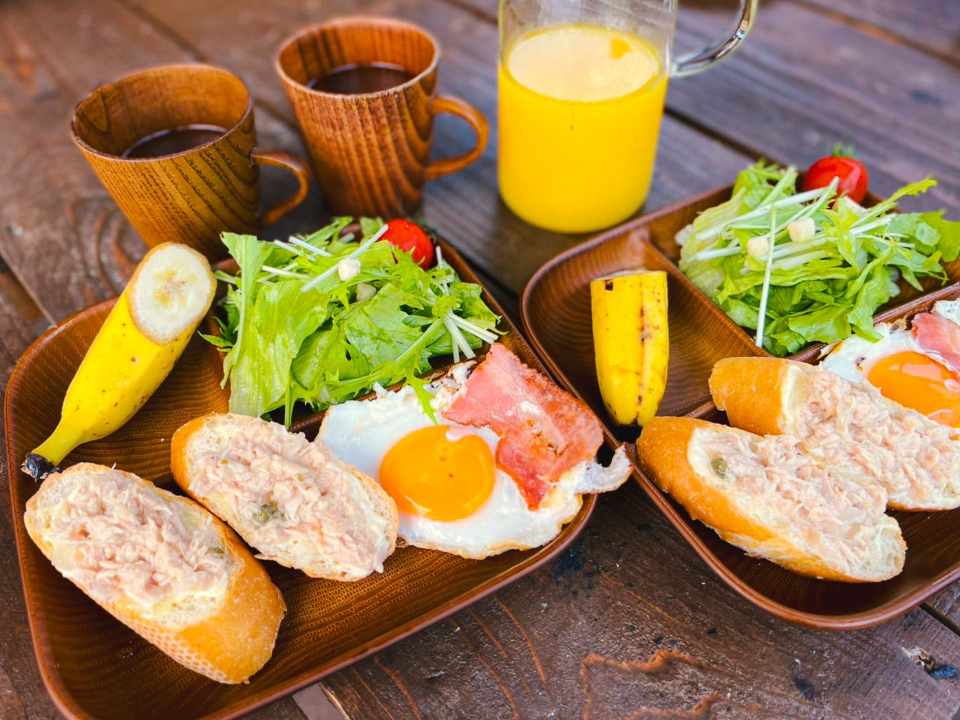 朝はホットサンドにコーヒーなどキャンプと自然を感じられる王道グルメ。