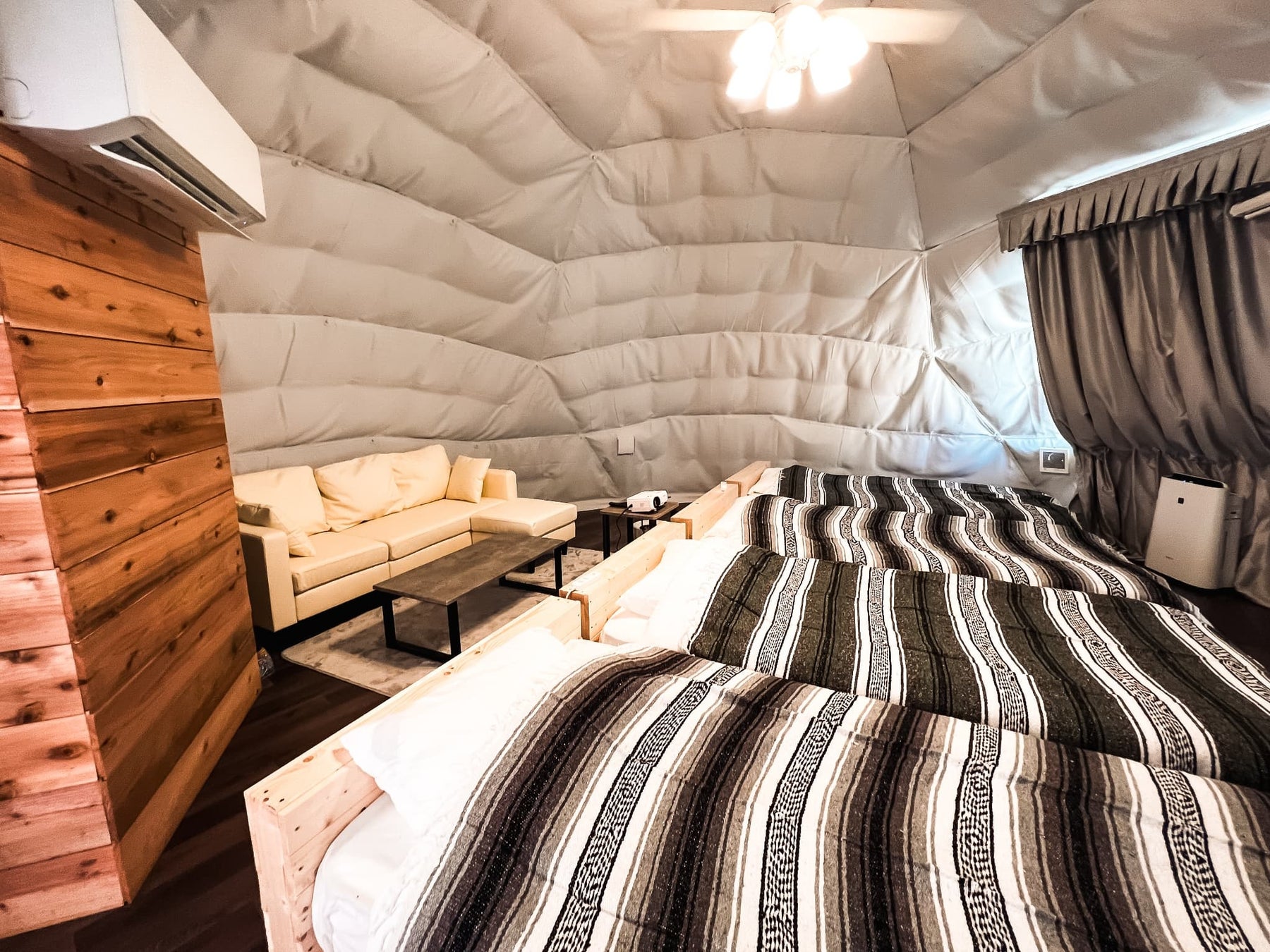 ユニークなドーム型テントはこだわりのインテリアに囲まれ、広々とした空間でテントから一望できる自然を感じながら、あなただけの“別荘”を夏から冬まで快適にお過ごしいただけます。