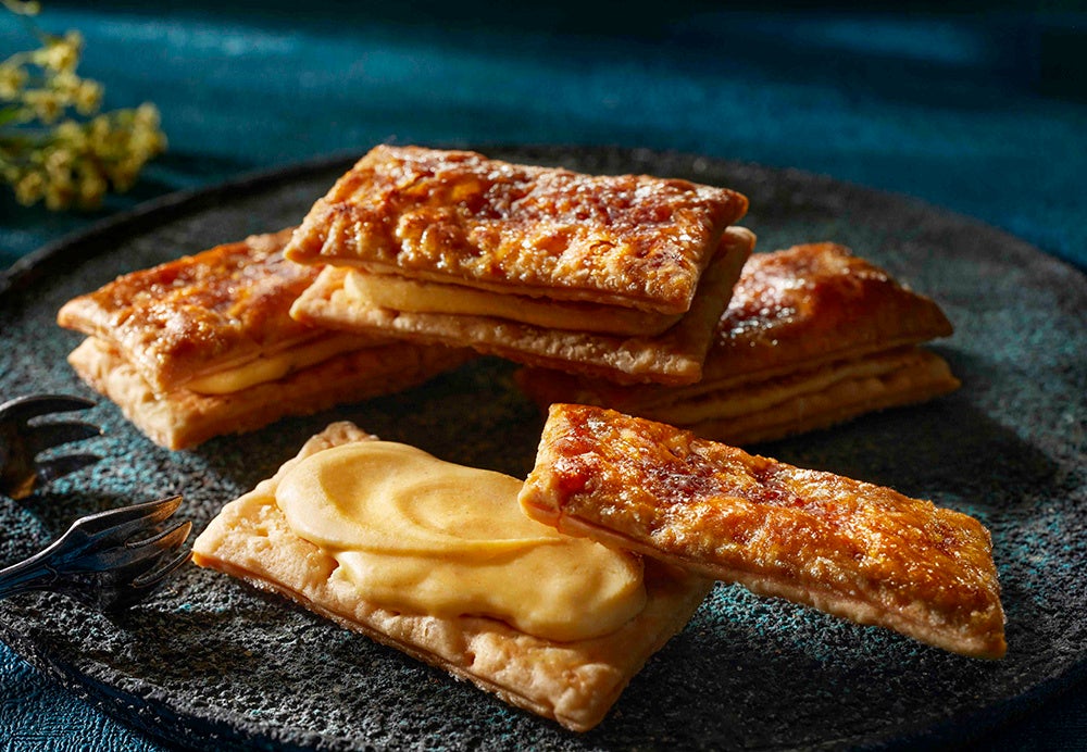 芳醇なラムバニラの薫りが、カスタード香るショコラクリームのコクを引き立てます。表面をブリュレ仕立てで香ばしく焼いたサクサクパイとの相性が絶妙です。