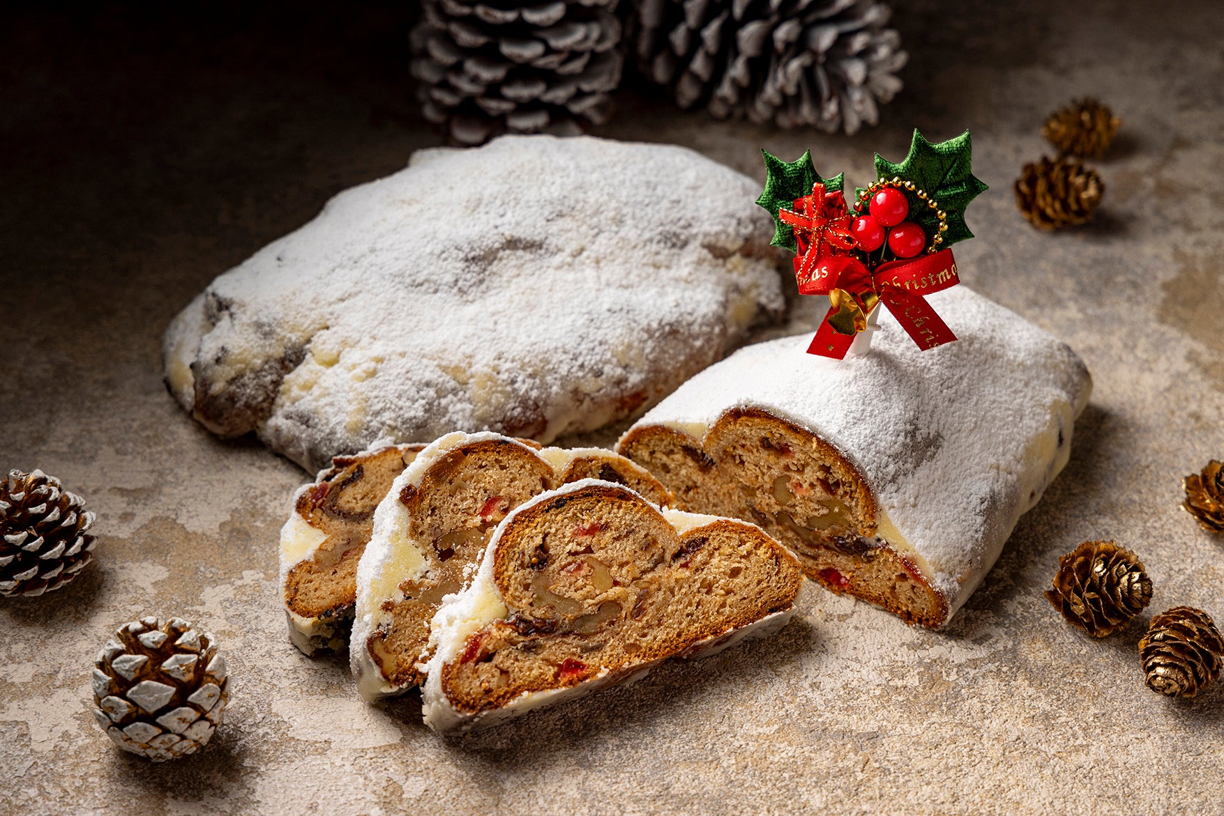 クリスマスの伝統菓子「シュトーレン」。バターをふんだんに使った生地に、濃厚で香り豊かなダークラムにじっくり漬けたクランベリーや無花果のドライフルーツとナッツをぎっしり入れた贅沢な焼き菓子。日ごとにしっとりとなじんでいく味わいの変化もお楽しみください。