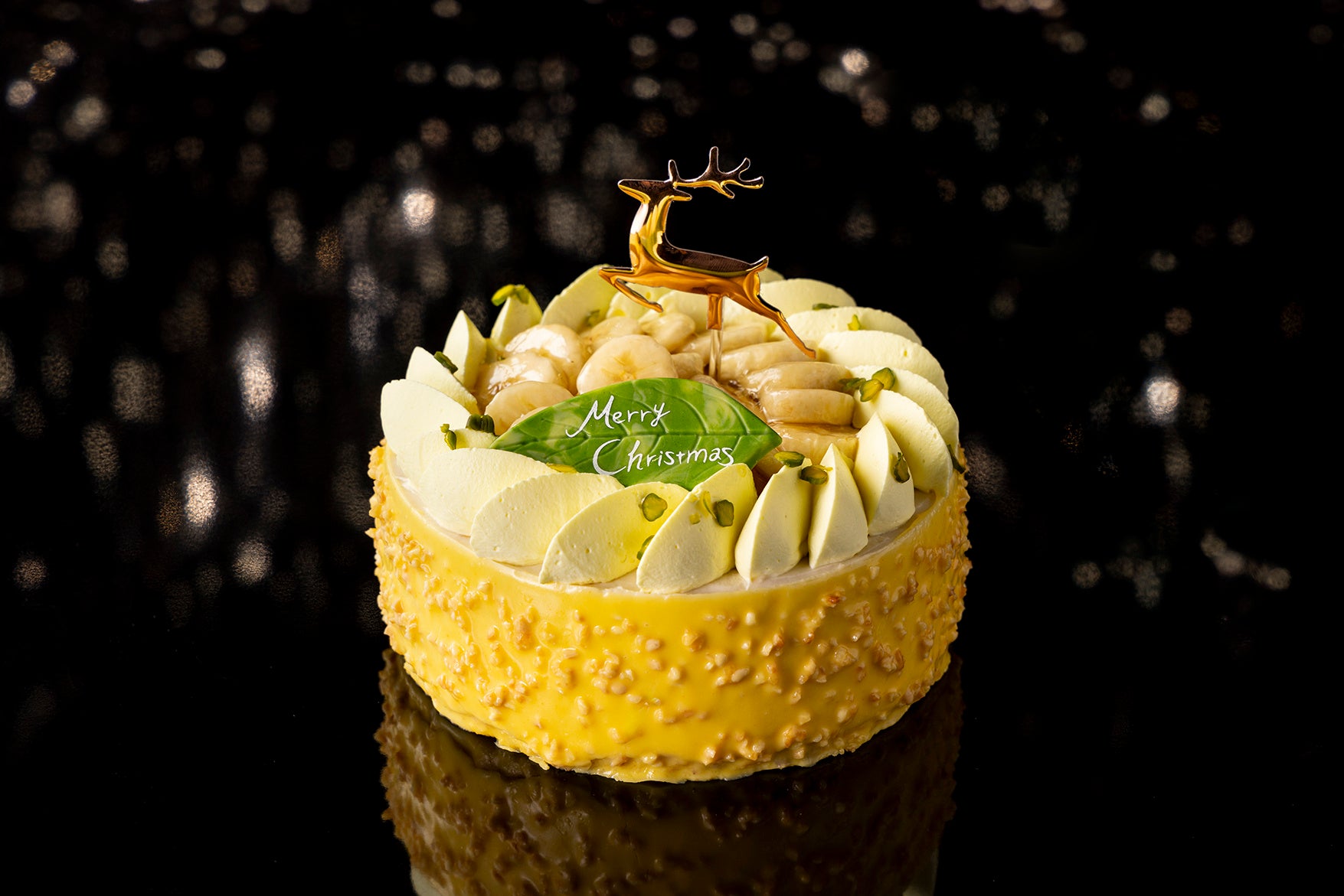 開業以来のロングセラー「ヒルトン小田原オリジナル バナナブレッド」をベースにした「キャラメルバナナムース」は、ヒルトン日本進出60周年を記念して考案されたスペシャルケーキ。香り豊かなバナナムースにソテーしたバナナとキャラメルムースを閉じこめました。芳醇にバナナが香るムースのふんわり食感とコーティングのアーモンドクランチバナナチョコレートのカリッっと食感が相まって、クリスマスのわくわく感をより一層高めてくれます。