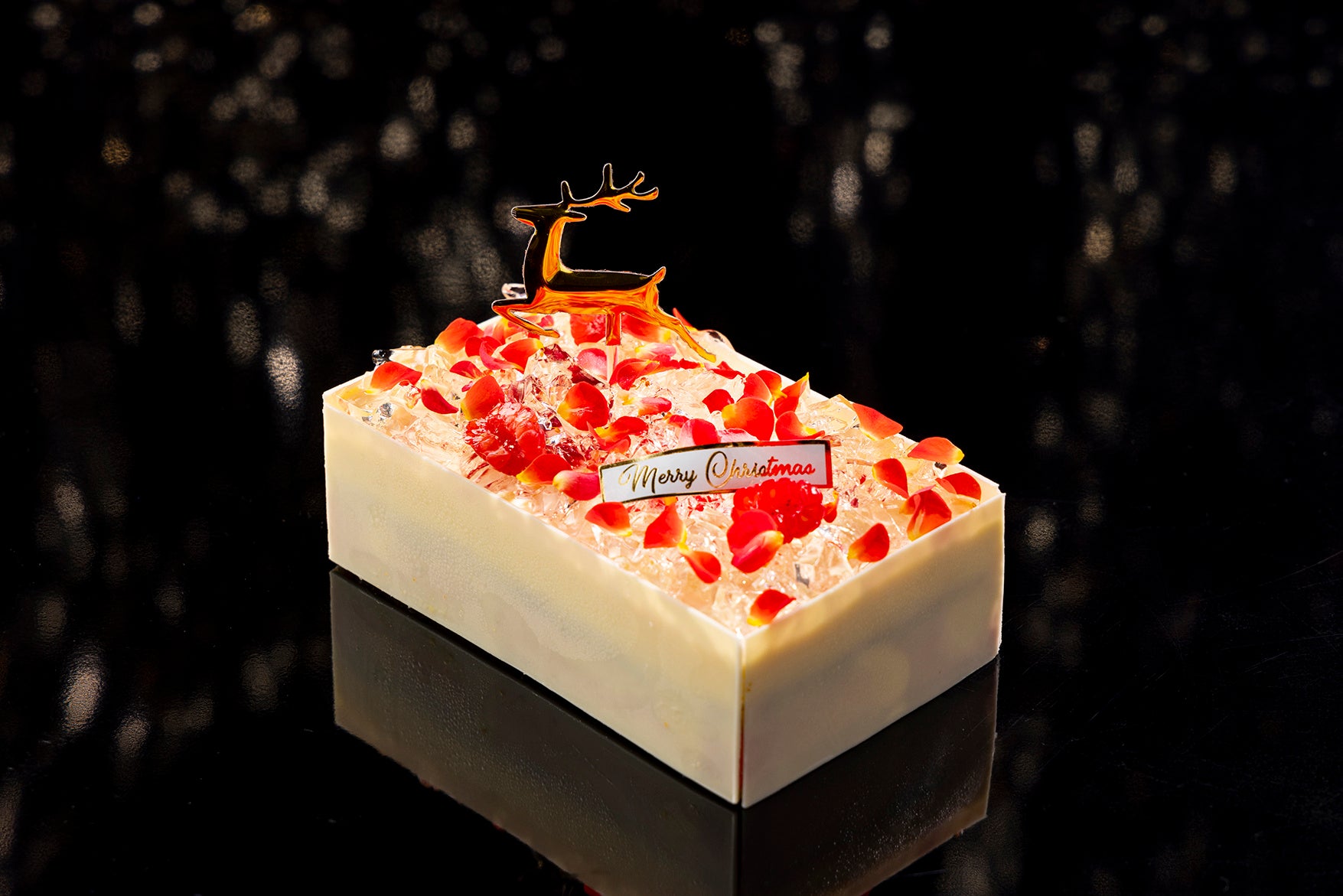 美しい真紅の色、気品高い香りを持つオーガニックエディブルローズ(食べられるバラ)「さ姫」と世界中で愛されているシャンパン“モエ・エ・シャンドン”を使用したムースケーキ。層に重ねたエディブルローズのジャム、シャンパンムースとラズベリームースの上に、贅沢に飾ったバラの花びらと煌めくシャンパンゼリーがクリスマスをよりゴージャスに演出します。
