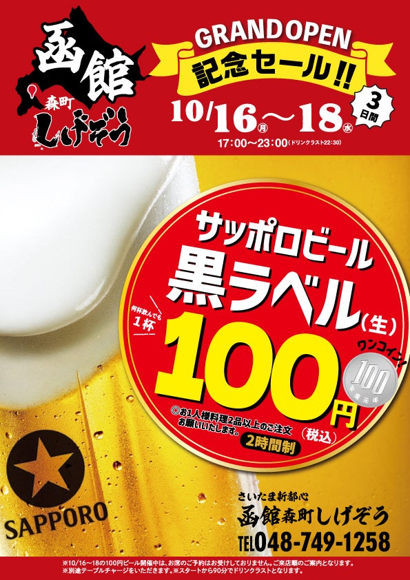 さらにオープン記念として、10月16日(月)~18日(水)の3日間限定で生ビールがワンコイン100円に!この機会に是非、「函館 森町しげぞう」へお越しください。