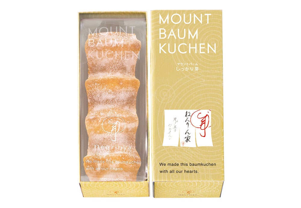 ねんりん家の代表作。⽪はカリッ、中はしっとり熟成の『マウントバーム しっかり芽』。濃厚なバター⾵味の⽣地を、独⾃の窯で⻑時間じっくり焼きあげておいしさを引き出した、こだわりのバームクーヘンです。