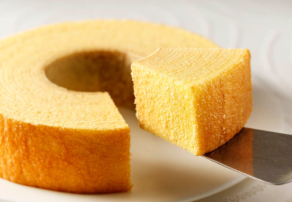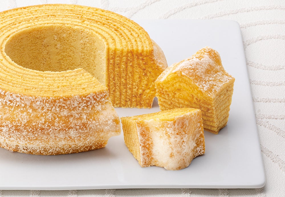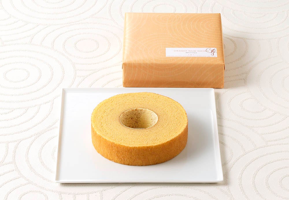 ねんりん家の誇る⼆⼤バームクーヘンのひとつ『ストレートバーム やわらか芽』。⽇本の味覚にふさわしい柔らかさを⽬指し、たっぷりの卵を贅沢に使ってふっくらとジューシーに焼きあげました。