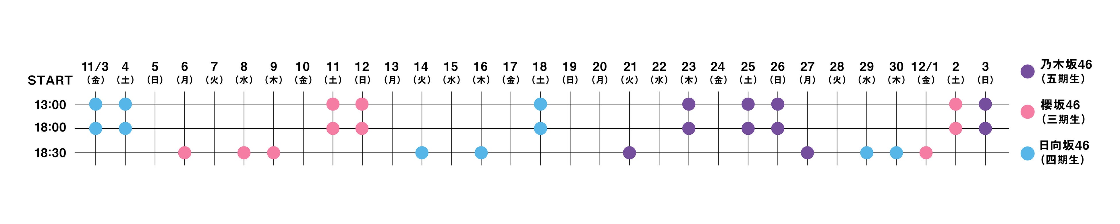 乃木坂46 五期生:12月3日(日)最終公演、櫻坂46 三期生:12月2日(土)最終公演、日向坂46 四期生:11月30日(木)最終公演