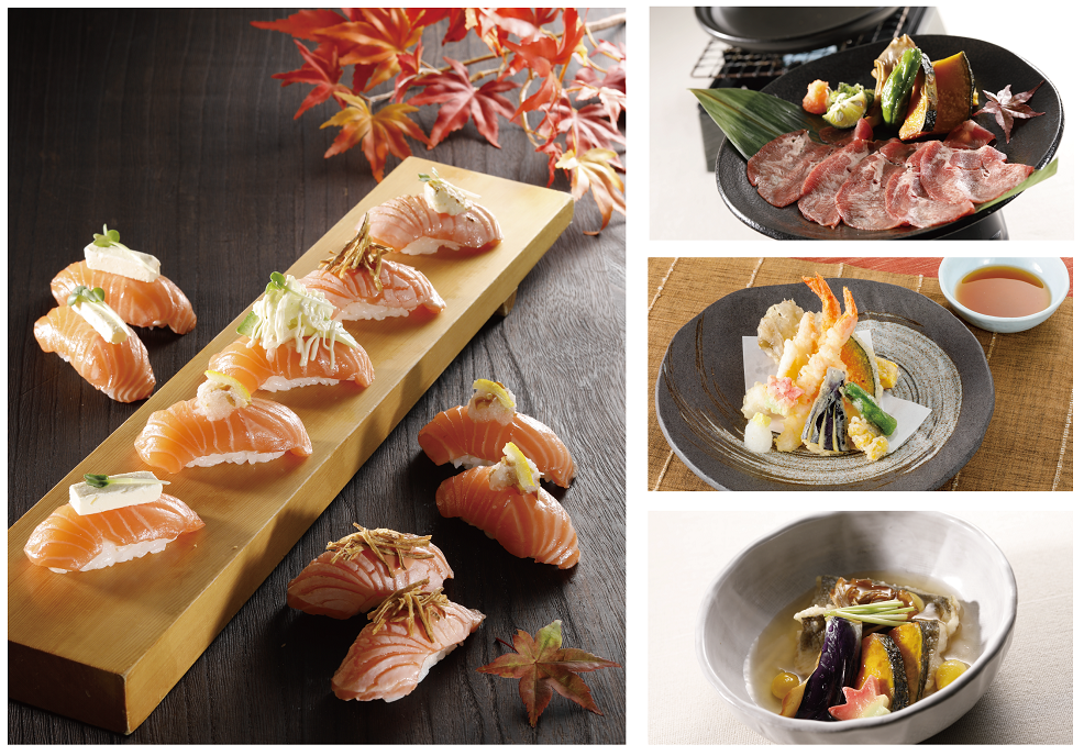 この秋はオーロラサーモンを使用した創作寿司をはじめ、牛タンの陶板焼き、季節の天ぷら盛り合わせ、かますと野菜の炊き合わせ(*)など、寿司はもちろん、焼きもの・揚げもの・煮ものなど、さまざまなメニューをご用意し、皆様のご来店をお待ちしております。