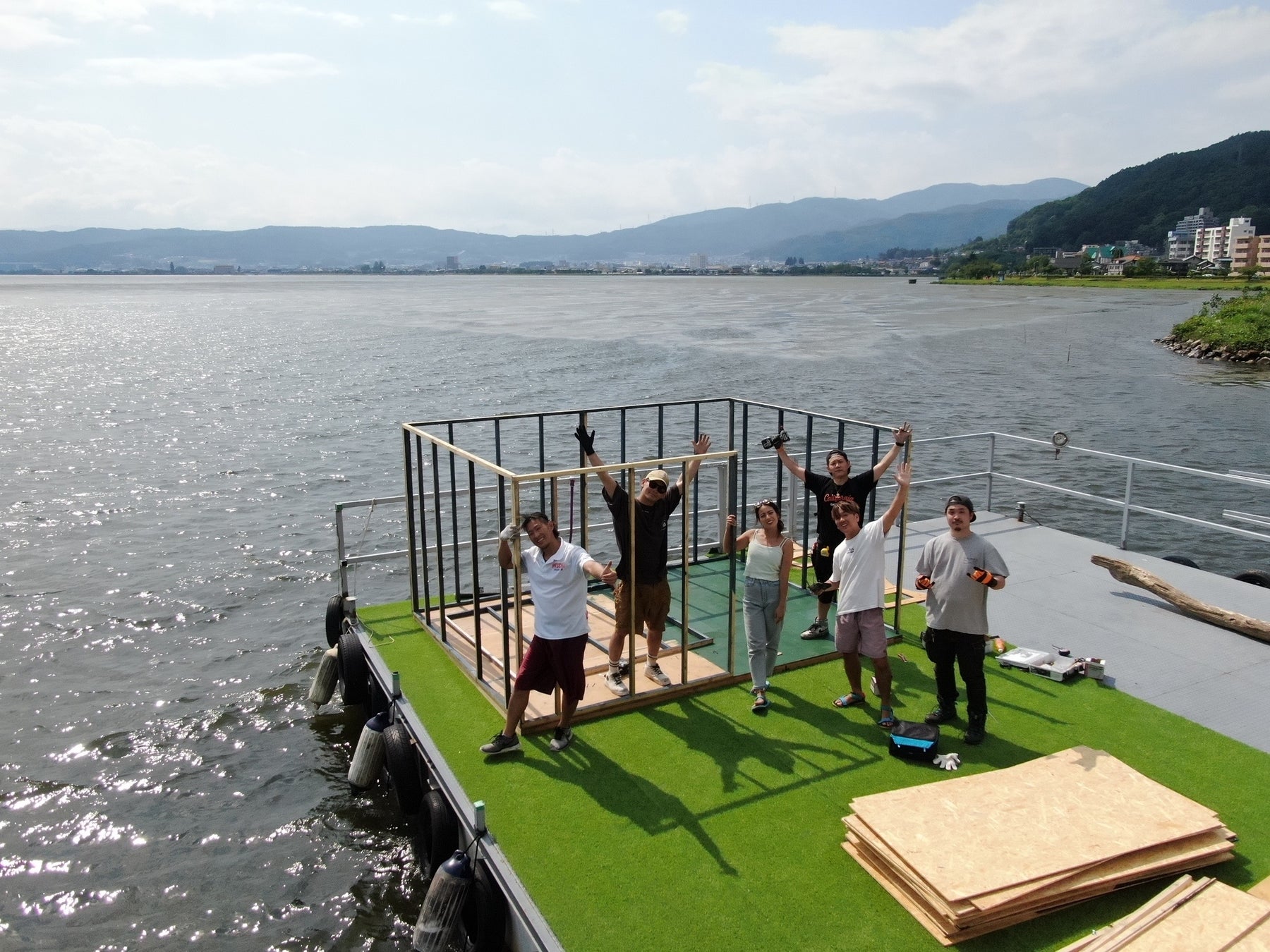 フローティングサウナチームを作り、DIYで6人ほどで約5日間で水上アスレチック搭載のフローティングサウナを作りました。