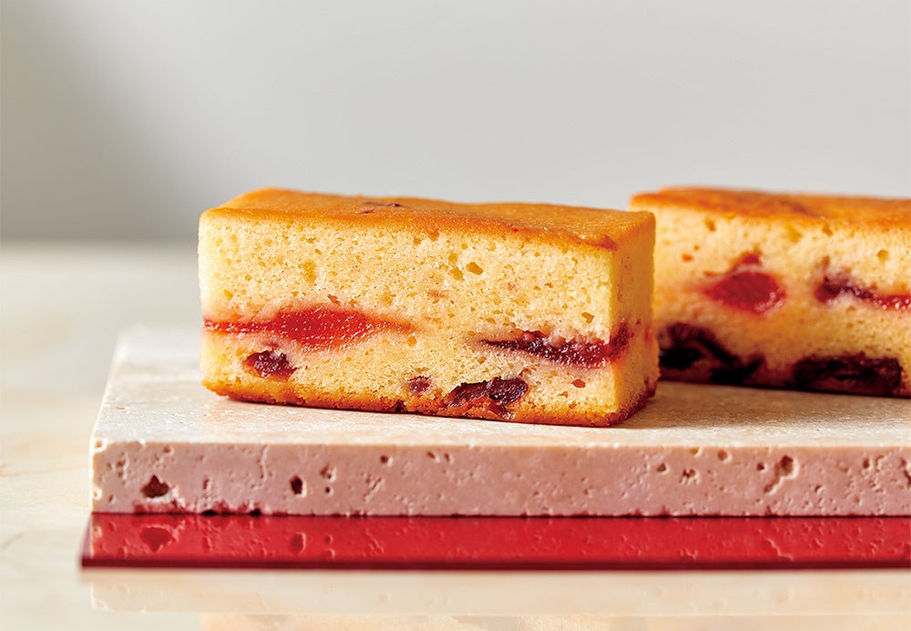 あまおう苺100%の果肉と果汁をとろっと煮詰めた優しい甘さのコンフィチュールに、クランベリー果肉のしっかり食感を加え、クリームチーズとカマンベールチーズで、じっくり・しっとり・ジューシーに焼き上げました。