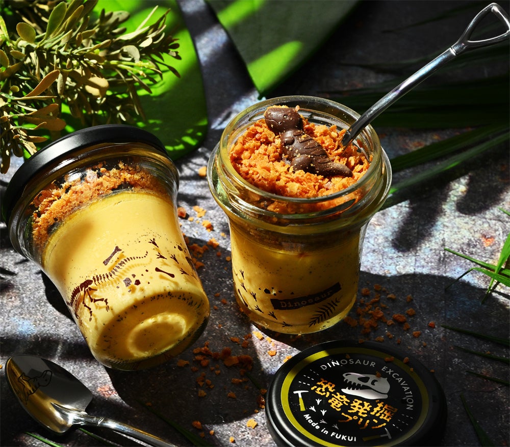 プリンの中には恐竜チョコが入っていて恐竜を発掘するように楽しみながら食べられるプリンです。