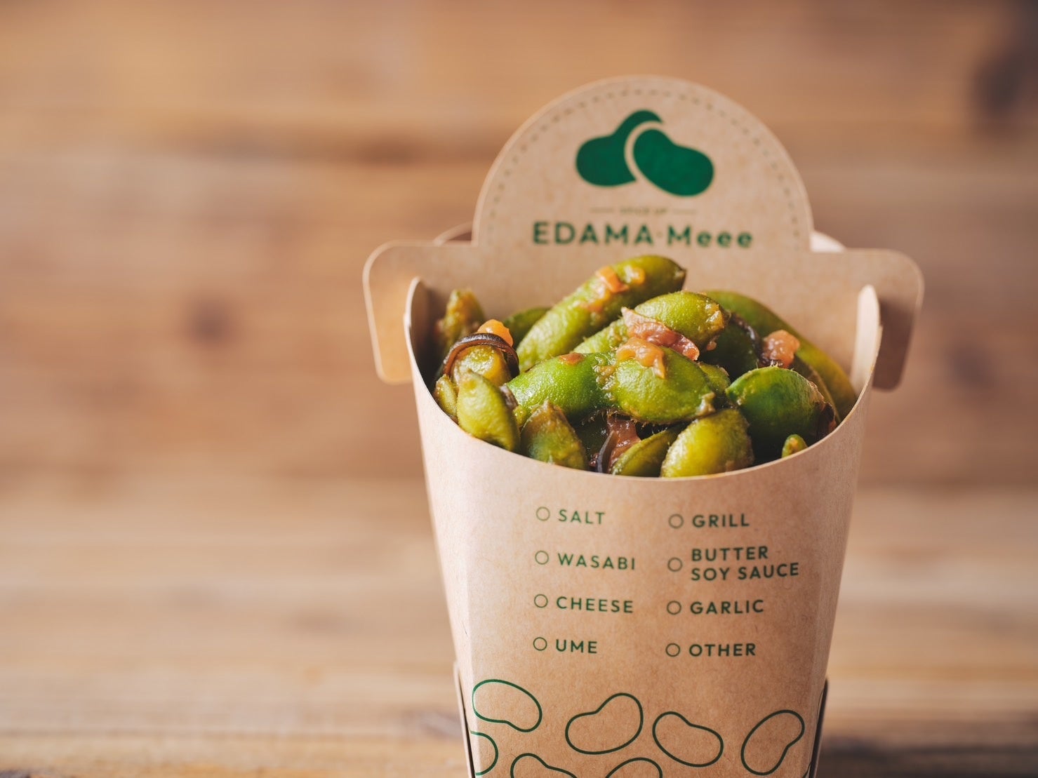 「SPICE UP EDAMA・Meee」は、蒸し枝豆にワサビや梅、ペペロンチーノなどで味付けした、日本初のフレーバー枝豆専門店です。「枝豆=おつまみ」というイメージですが、当店では新感覚の食べ歩きグルメとしておやつ感覚で楽しんでいただきたいと、フライドポテトのような紙容器で提供します。食べ終わった枝豆のサヤがゴミにならないよう、紙容器には仕切りを設け、ガラ入れを備え付けました。