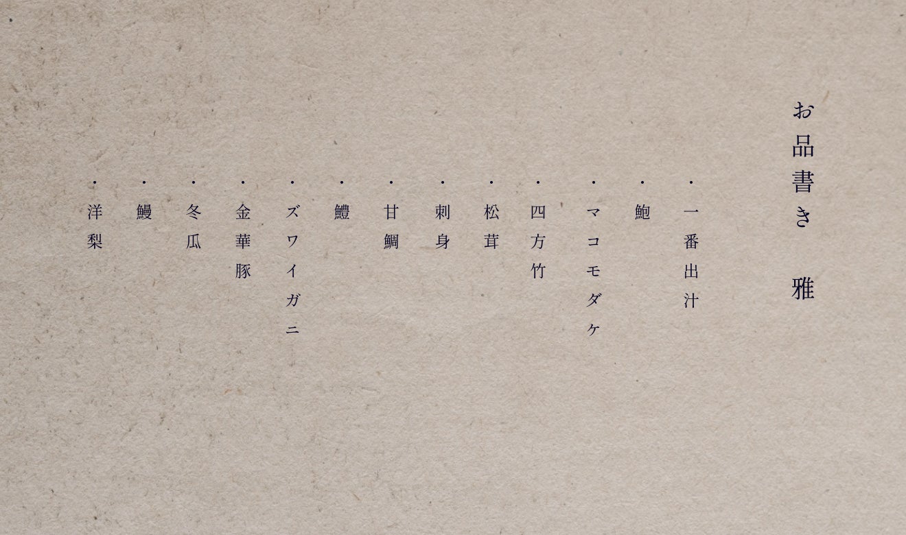 通常コース”雅”では、出汁を中心にお食事をご提供します。多種多様な食材と出汁のマリアージュをお楽しみいただきながら、素材そのものの良さを発見できるコースとなっております。