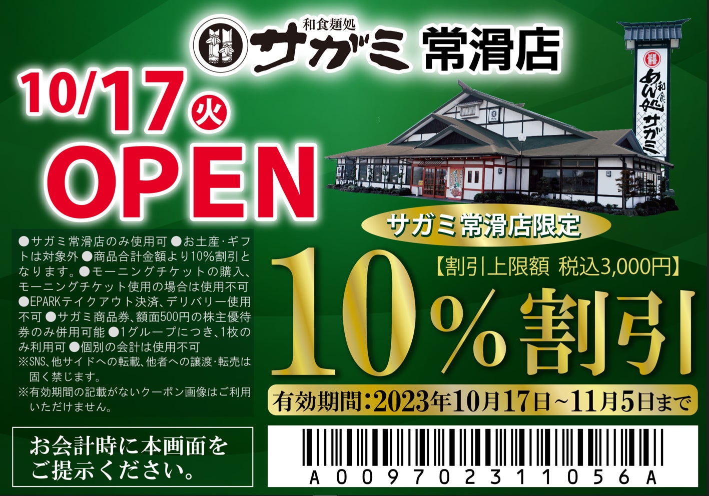 また、サガミ常滑店限定でご利用いただける割引券を記載いたしました。