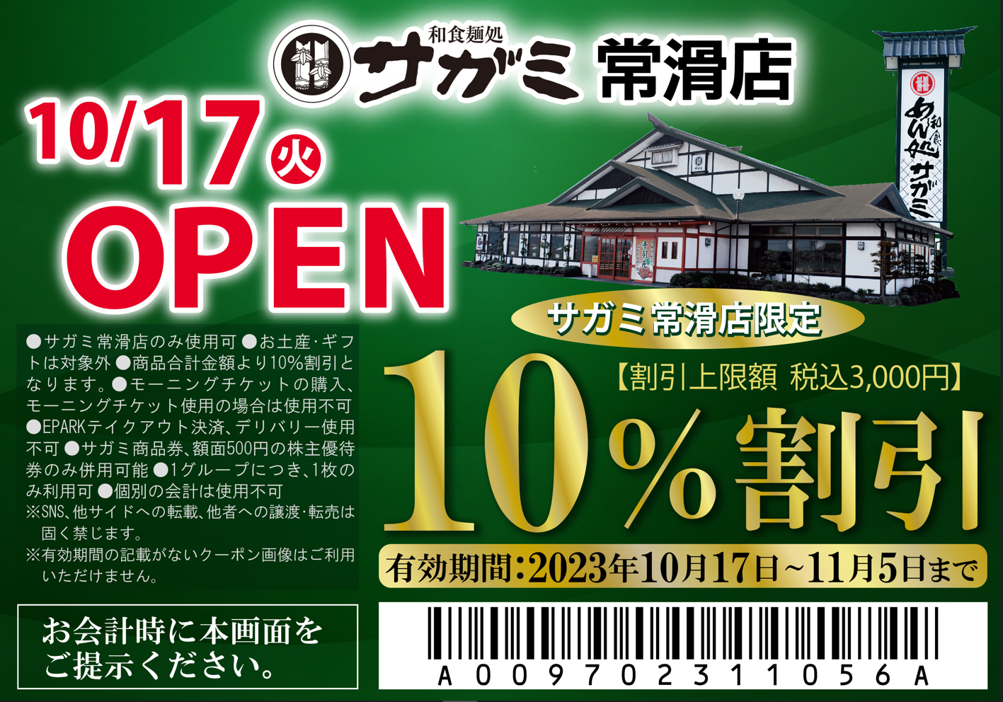 また、サガミ常滑店限定でご利用いただける割引券を記載いたしました。