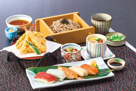 サガミ自慢の麺・天ぷら・寿司・茶わん蒸しをセットにしたお値打ちな商品です。
