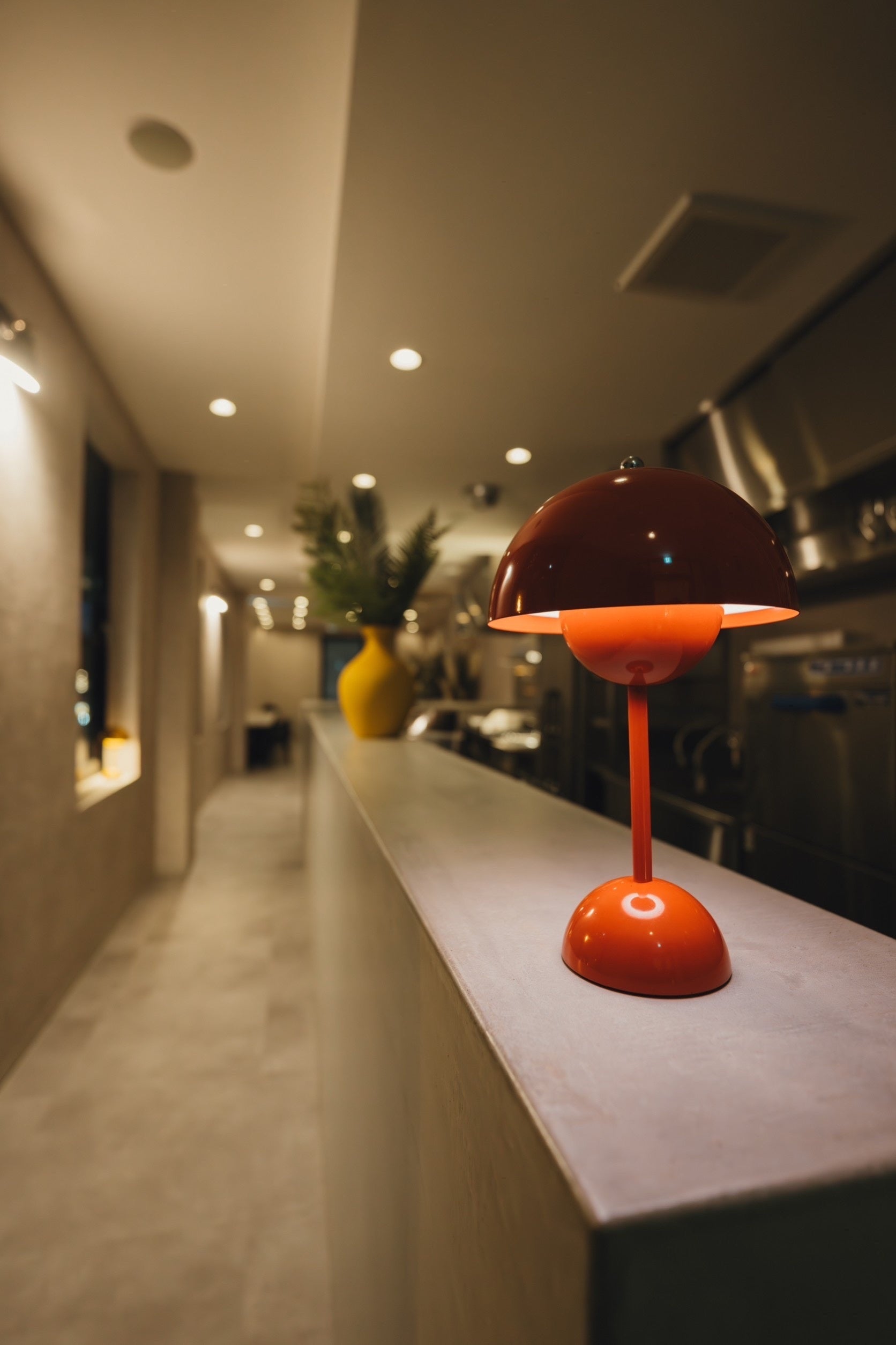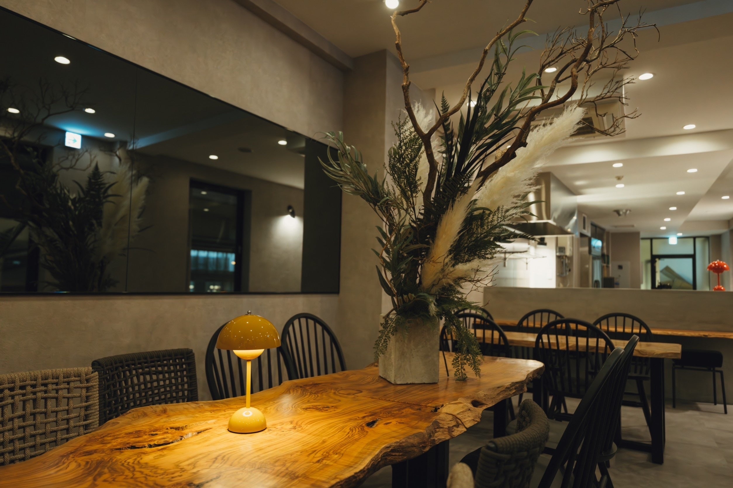 ポップカラーのインテリア、「樹齢100年超えの桜」の大木を利用して制作したテーブル、コンクリートのカウンターなどアートな空間の店内で梅田の夜景を見渡しながらお食事を楽しむことが出来ます。