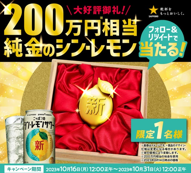 サッポロホールディングス(株)のグループ企業であるサッポロビール(株)はサッポロ ニッポンのシン・レモンサワー「大好評御礼!200万円相当純金のシン・レモン当たるキャンペーン」を10月16日から実施します。