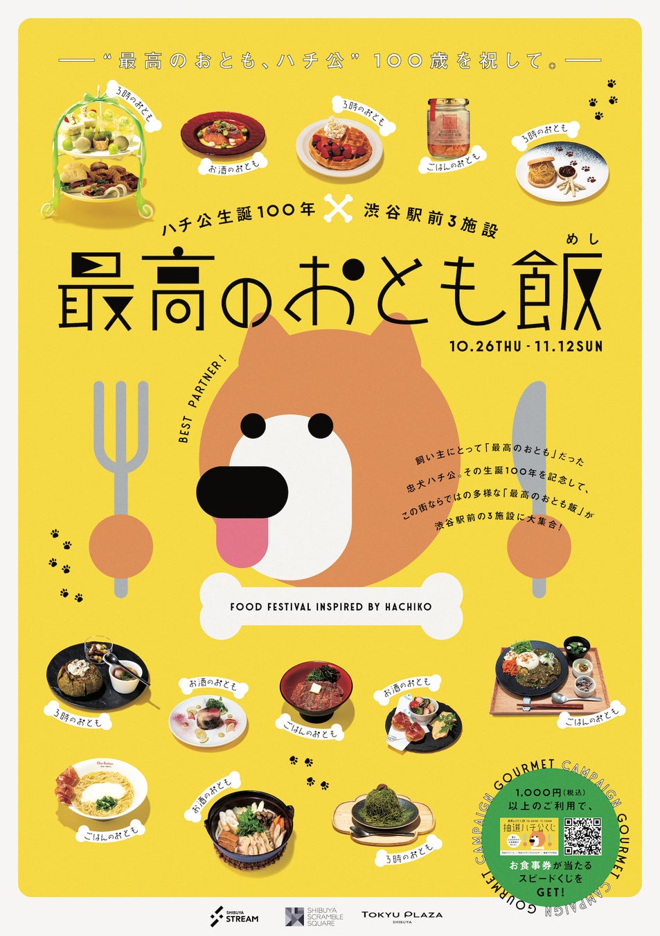 飼い主にとって「最高のおとも」だった忠犬ハチ公 。その生誕100年を記念して、この街ならではの多様な「最高のおとも飯」が渋谷駅前の 3 施設に大集合!「渋谷スクランブルスクエア」、東急不動産SCマネジメント株式会社が運営する「東急プラザ渋谷」、ならびに東急プロパティマネジメント株式会社が運営する「渋谷ストリーム」(以下、3施設)は、各施設約60店舗とコラボレーションをして、『お酒のおとも』『ごはんのおとも』『3時のおとも』をテーマに、ハチ公に負けない“最高のおともメニュー”が勢ぞろい。また、3施設合同「おとも飯」スピードくじキャンペーンを開催します。ハチ公の出身地・秋田名物きりたんぽ鍋をイメージしたうどんやいぶりがっこを使ったモンブランモナカなど、個性あふれるグルメでハチ公をお祝いします。