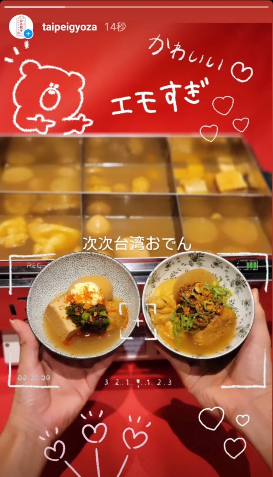次次が提供する台湾おでんは、八角など5種のスパイスを配合した五香粉(ウーシャンフェン)の出汁の香りから台湾を感じる商品です。また、セルフで楽しめるのも特徴で、全12種類のトッピングを用意しており、甘さも辛さも自分好みに味付けすることができ、自分だけのオリジナルおでんを楽しむことができます。どこかエモい懐かしさがついつい写真に撮りたくなる!