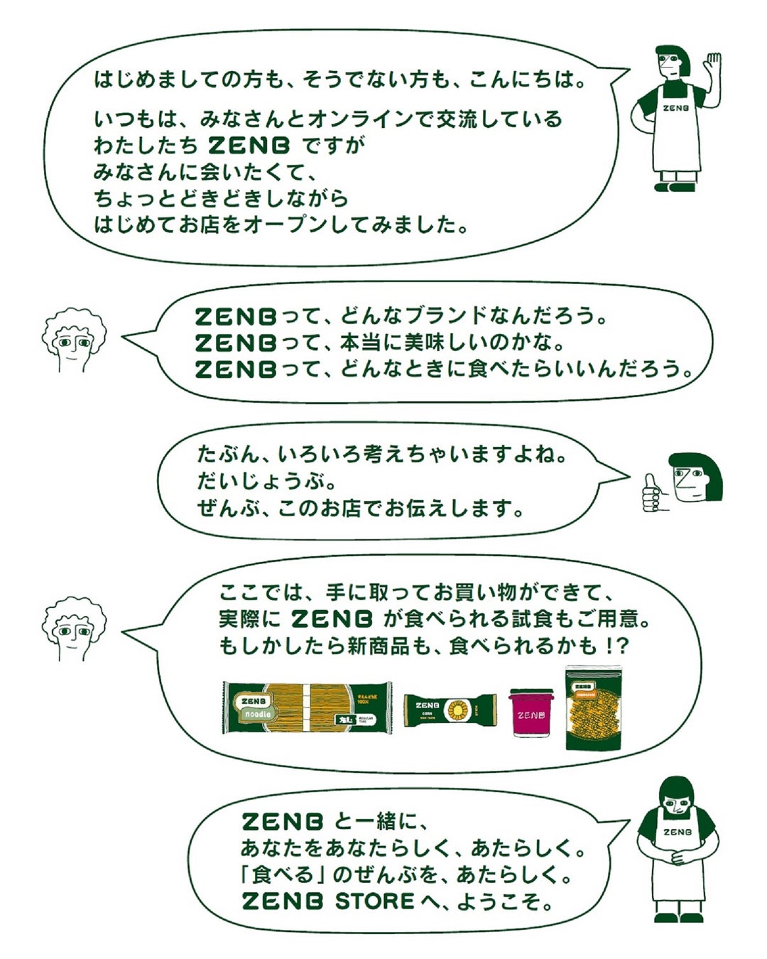 累計販売食数1,300万食を突破した「ZENBヌードル」を始め、オンライン中心に販売するZENB商品の購入や試食体験に加え、ZENBブランドに共感する様々な分野のコラボレーターによるストア限定のスペシャルコンテンツも実施。ここでしか手に入らない手ぬぐい専門店「かまわぬ」とのオリジナルグッズやZENBアイスやZENB弁当などのコラボメニューも販売します。